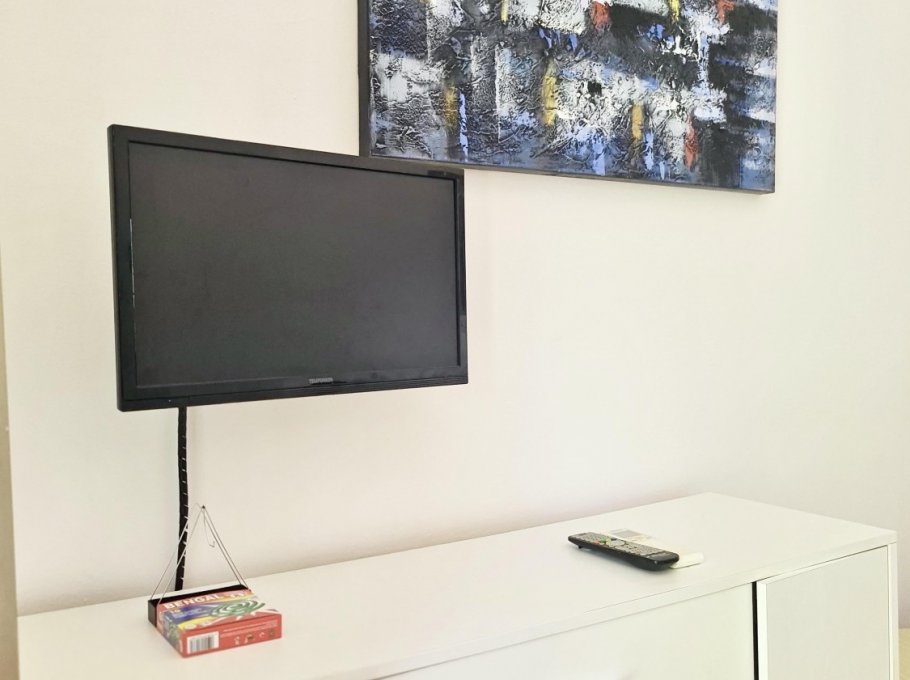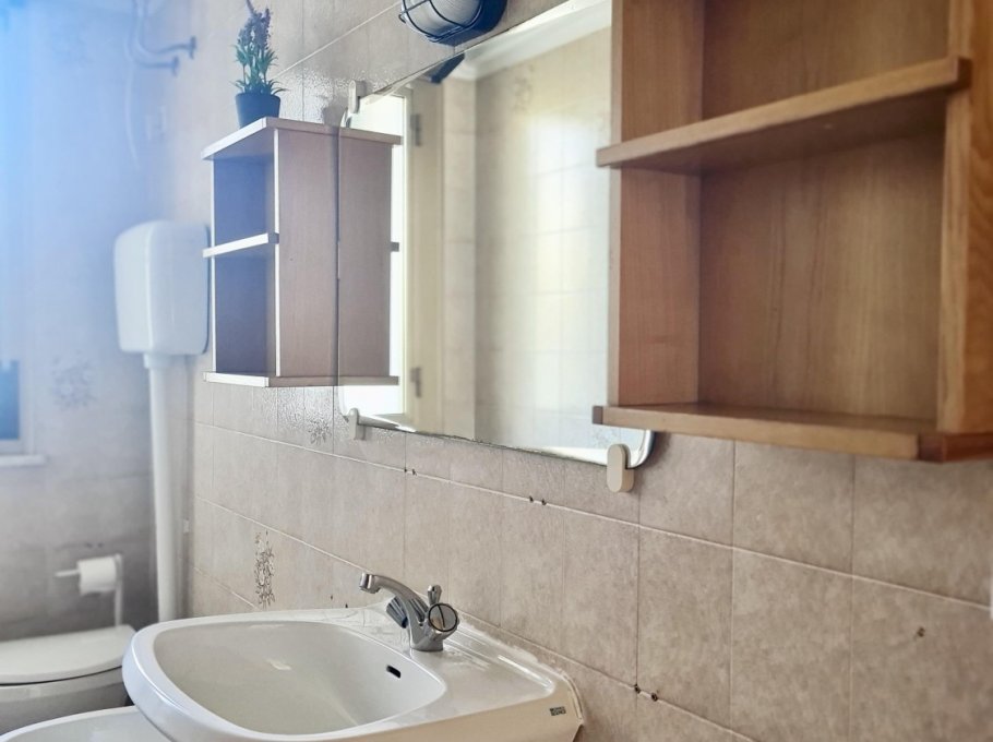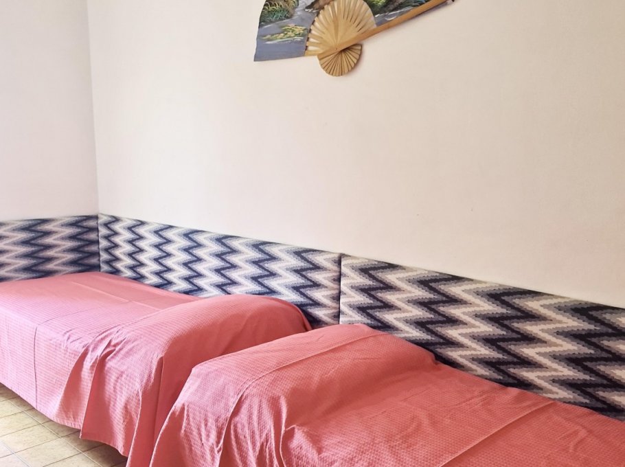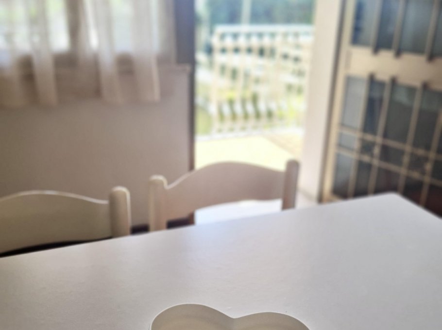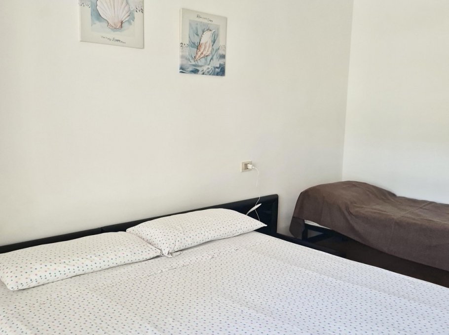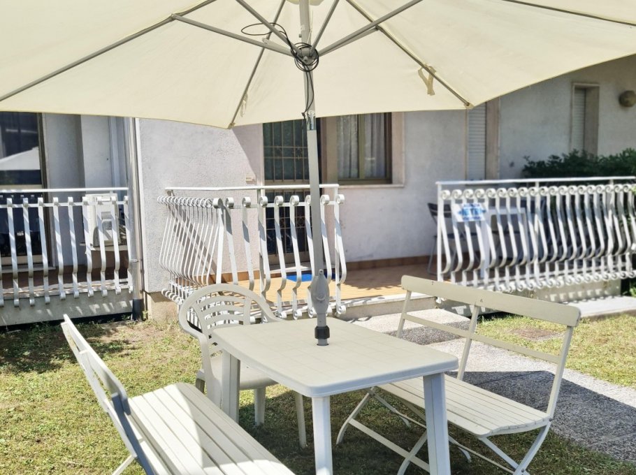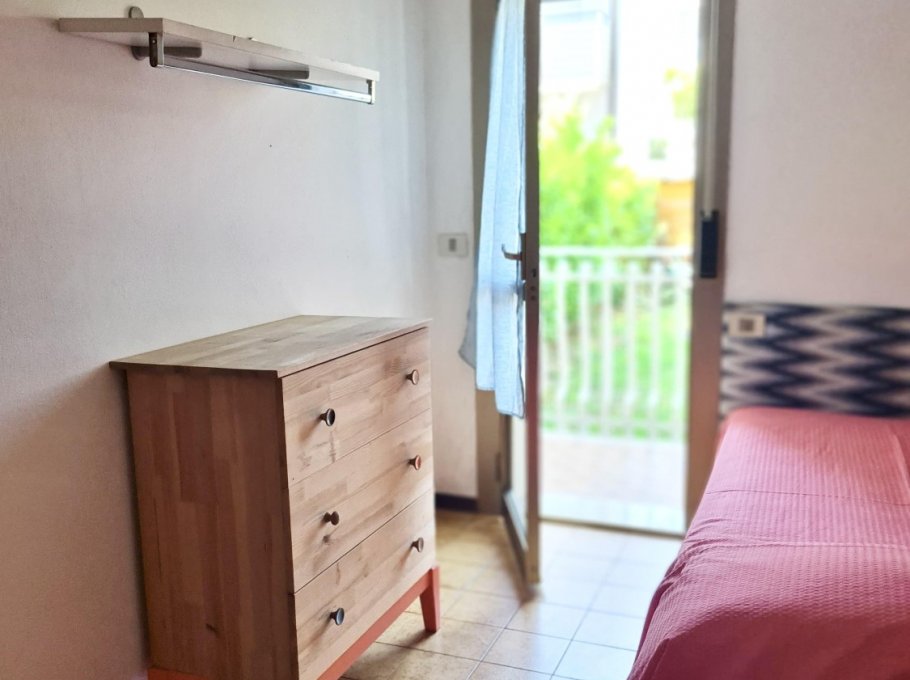 Apartment on the ground floor with independent entrance and private garden, equipped with living room and cooking area, microwave, TV and single bed sofa, 1 sleeping room with a double bed and a single bed, 1 bedroom with 2 single beds and balcony, washing machine, bathroom with shower box and window, numbered parking place.