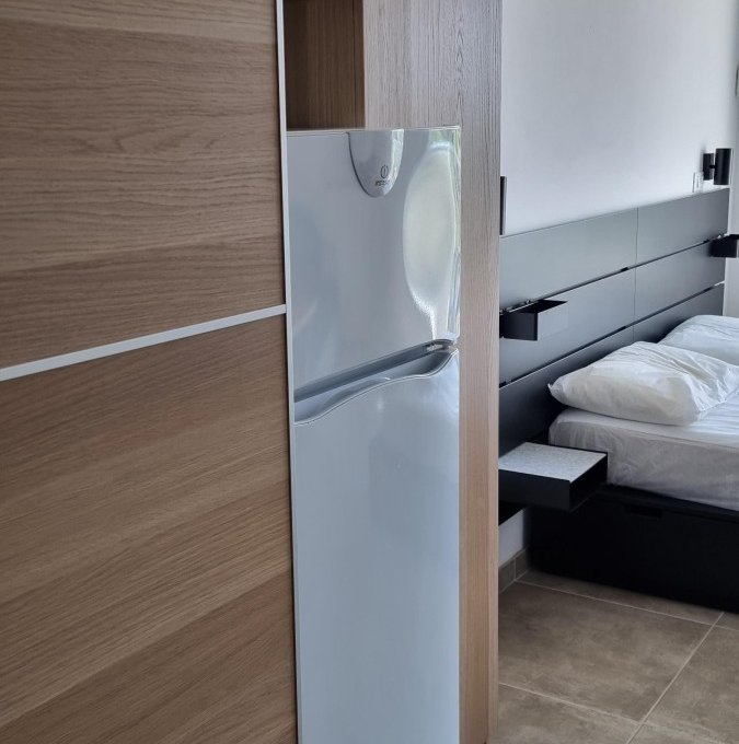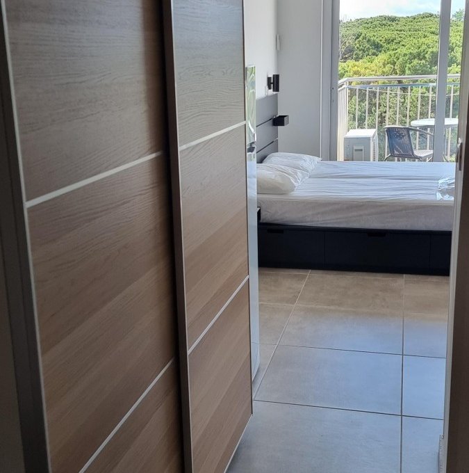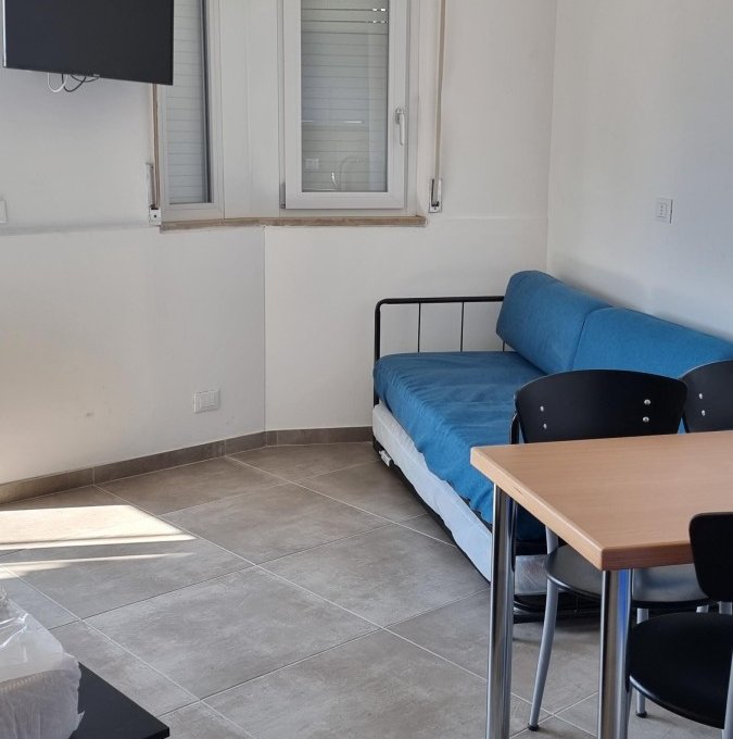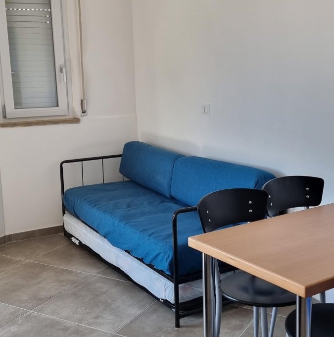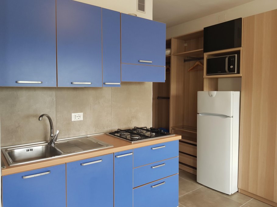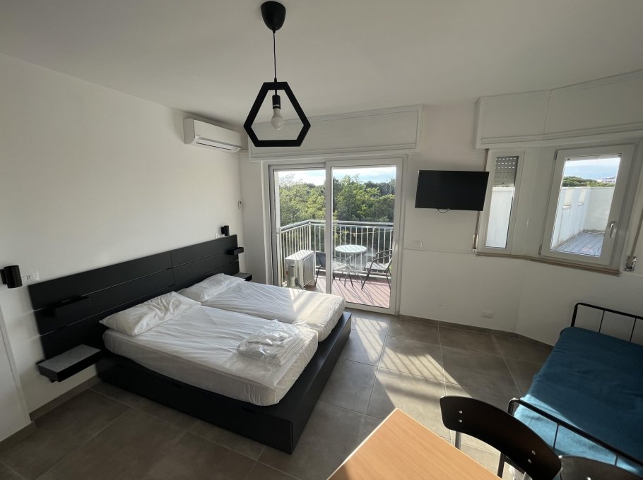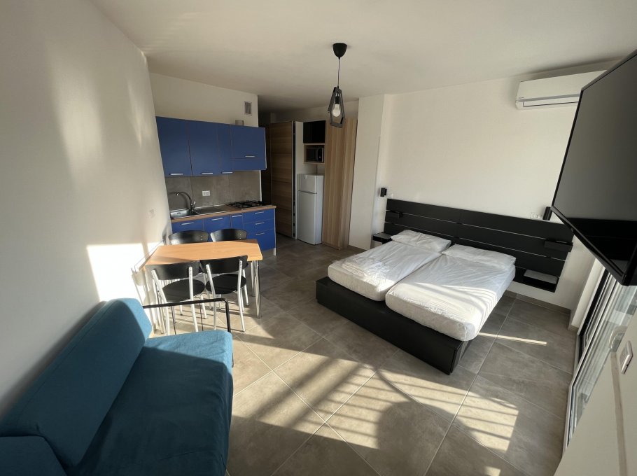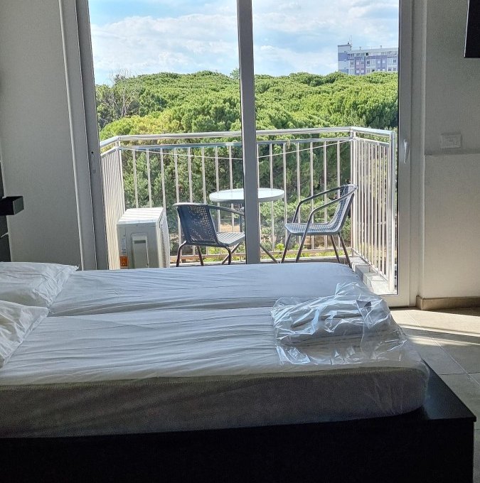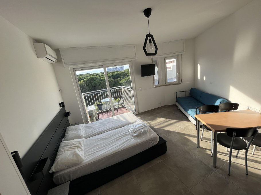 Studio apartment with a balcony facing the pine forest located in a building 10 meters far from the beach of Lignano Sabbiadoro. The studio apartment (35m2) is equipped with air conditioning, Internet WiFi and composed of an entrance with a modern wardrobe, bathroom with shower, living room, equipped kitchen with fridge, micro oven, dining table with chairs and TV, sofa bed, double bed, bedside tables and balcony overlooking the pine forest with table and chairs.