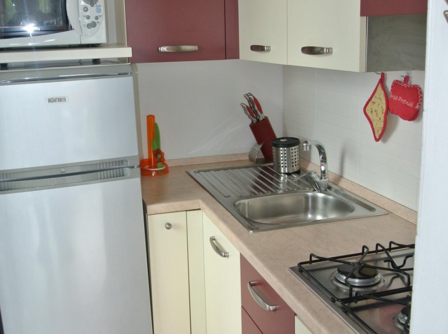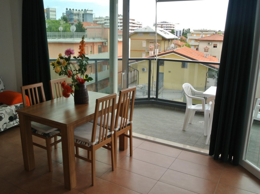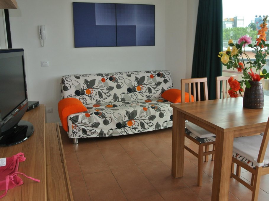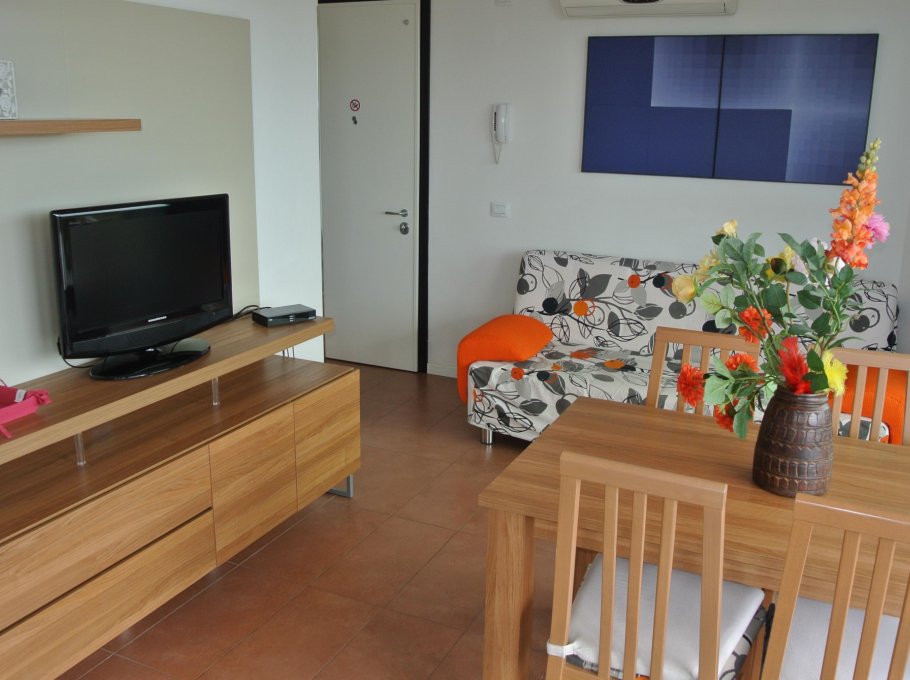 Appartement au deuxième étage se compose d’un salon avec canapé-lit et coin cuisine séparée, grande terrasse avec table et chaises, une fenêtre salle de bain avec douche, chambre à deux lits, une chambre double avec salle de bains et balcon. Door, machine à laver et lave-vaisselle, four micro-ondes, TV satellite, coffre-fort, air conditionné.