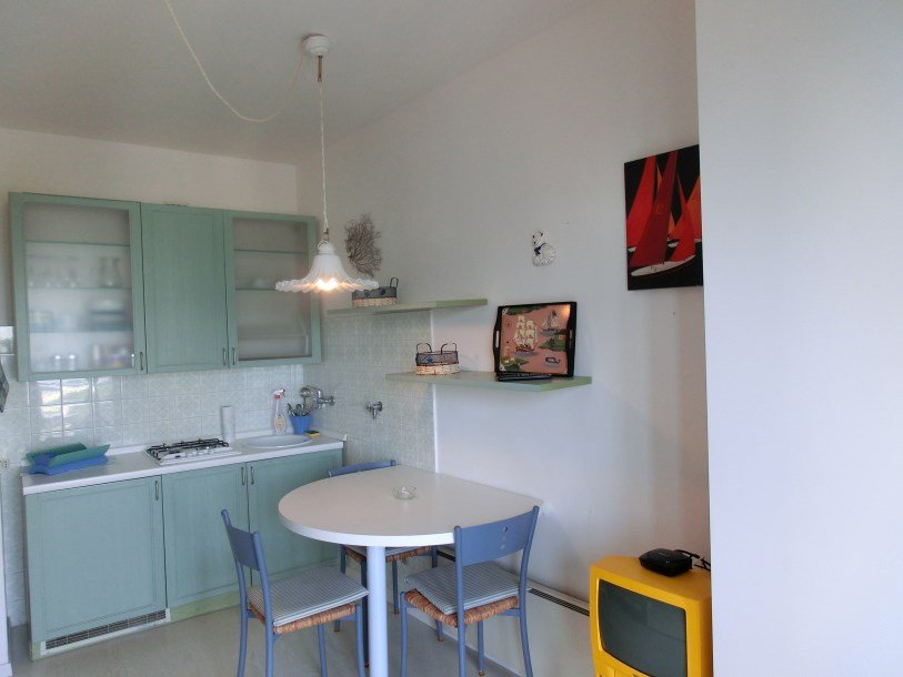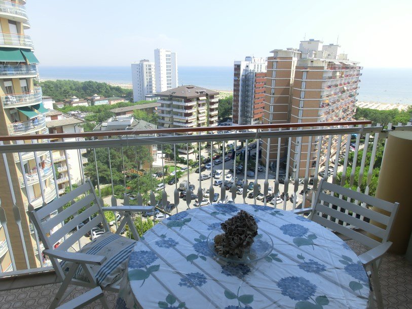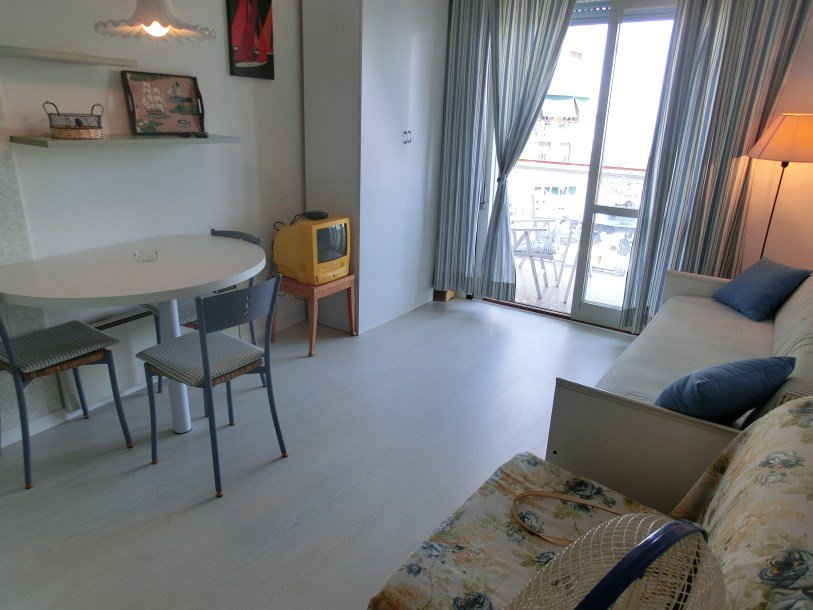 Bright renovated studio on the 10th floor, south-facing, composed of living room with kitchenette, double sofa bed and extra folding bed, bathroom with shower, terrace with beautiful front sea view, equipped with table and chairs. Modern furniture.