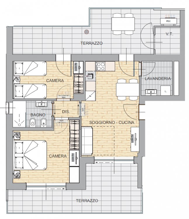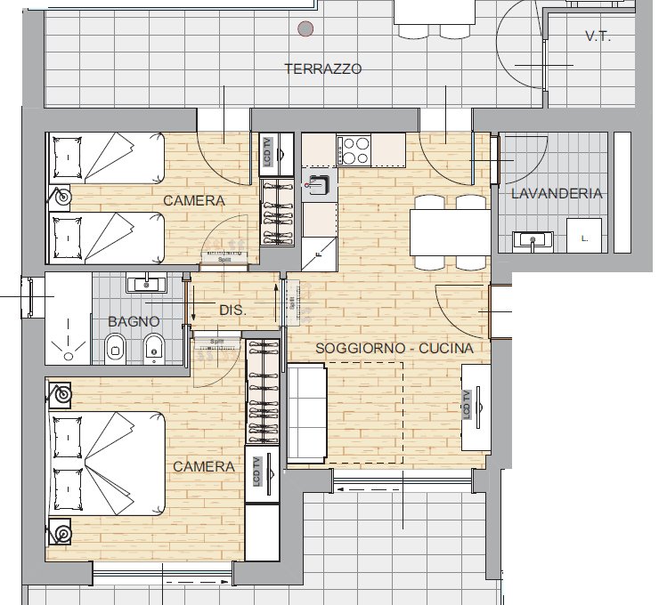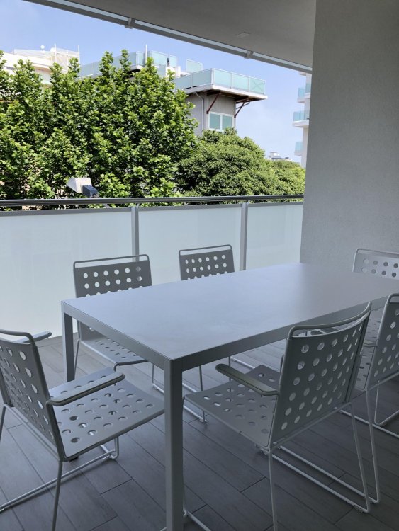 New three-room apartment with modern furnishings on the 4th floor with lift, consisting of 1 double bedroom, 1 bedroom with 2 beds, living room with sofa bed for 2 people, kitchen with dishwasher, microwave, fridge with freezer, induction hob, bathroom with shower / WC / bidet, 2 large and habitable balconies, washing machine, TV, safe, air conditioning, WiFi, numbered parking space.