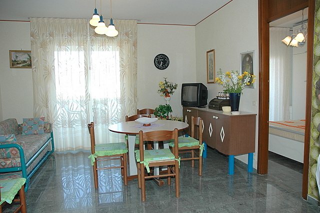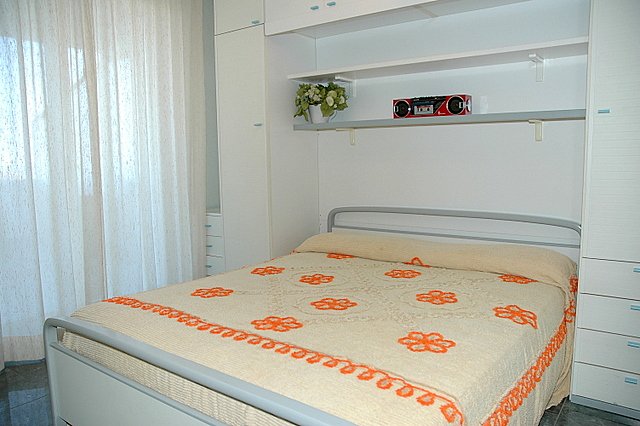 The apartment is on the 8th floor, and it has one double room, a bedroom with two single beds, living room with double sleeping sofa, cooking area, bath renewed with shower-box, a large balcony with view on the sea, air conditioned (on demand € 1,00 per kwt). Reserved parking place for 1 car near the house.