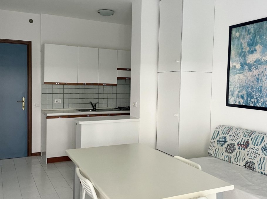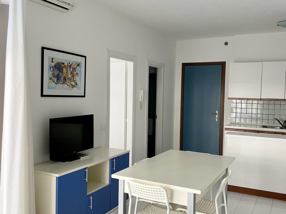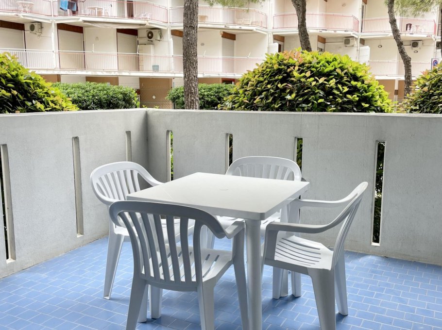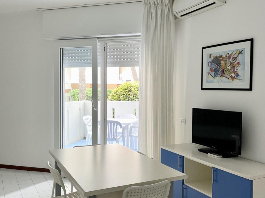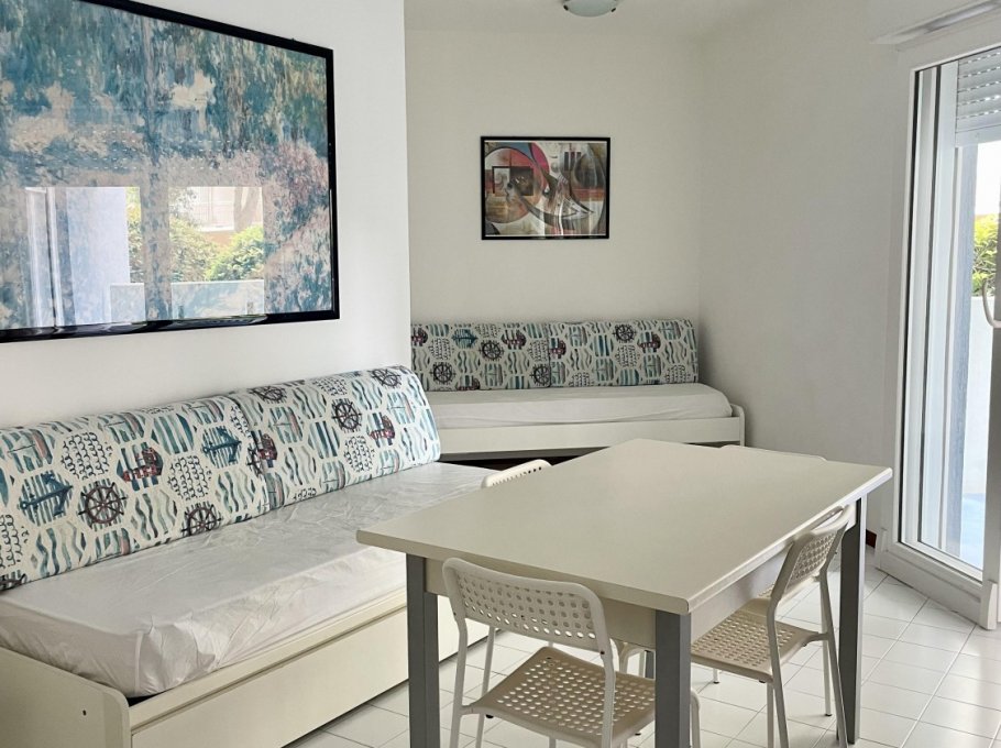 Two-room apartment located on the ground floor with large terrace, composed of living room with kitchenette, TV, double sofa bed and single sofa bed, bathroom with shower, double bedroom, air conditioning, numbered parking space and shared swimming pool.