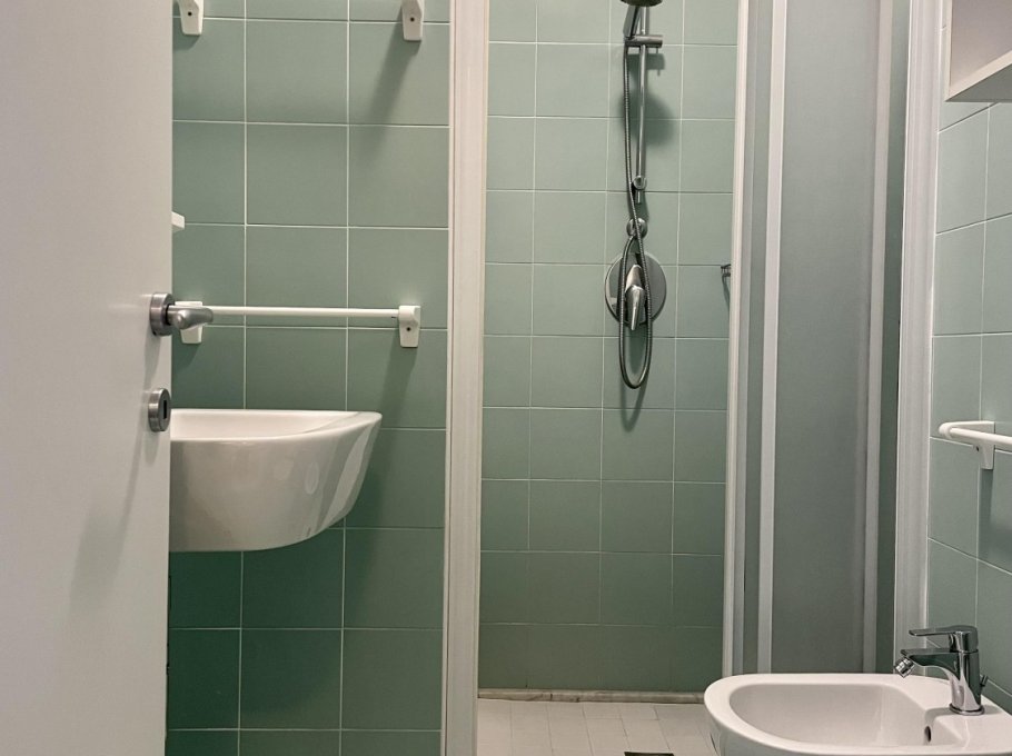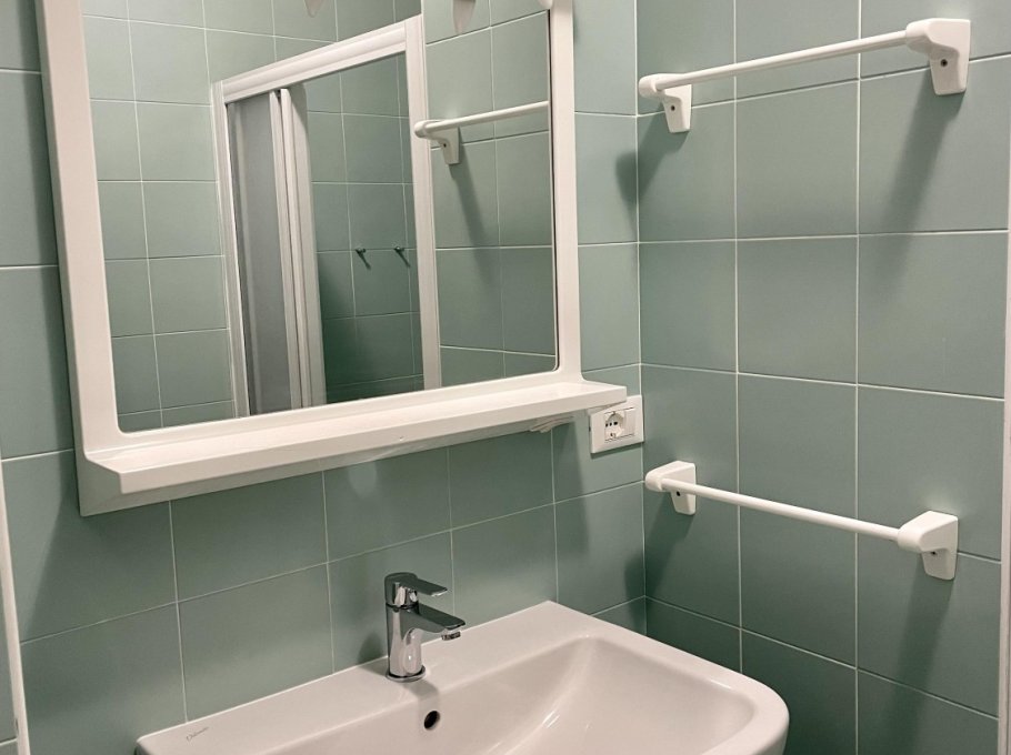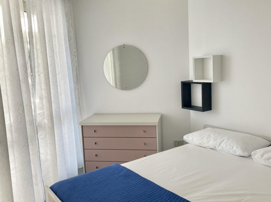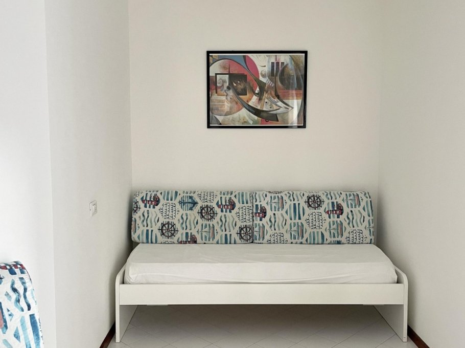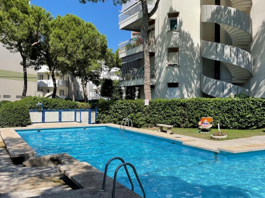 Two-room apartment located on the ground floor with large terrace, composed of living room with kitchenette, TV, double sofa bed and single sofa bed, bathroom with shower, double bedroom, air conditioning, numbered parking space and shared swimming pool.