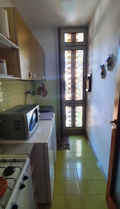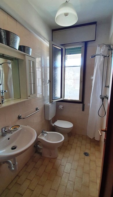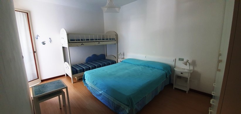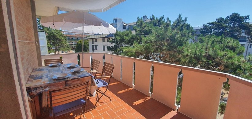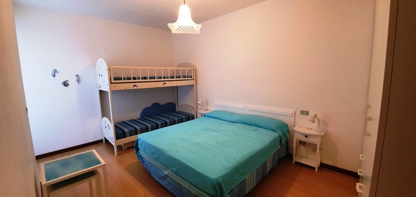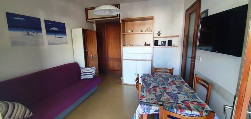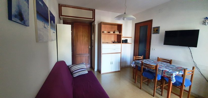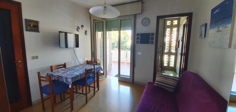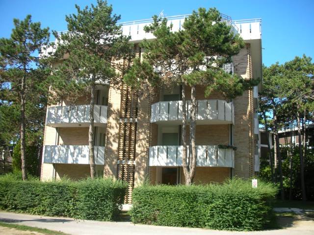 appartamento in piccolo condominio, dotato di ascensore, in mezzo al verde della pineta, a duecento metri dalla spiaggia, composto da soggiorno con angolo cottura, ampio terrazzo, una camera matrimoniale, terrazzino di servizio, bagno finestrato con doccia