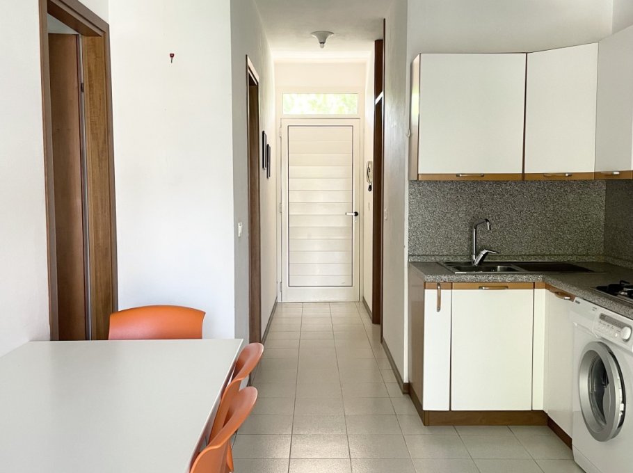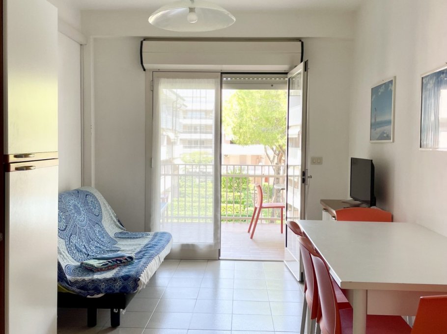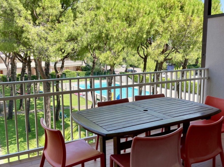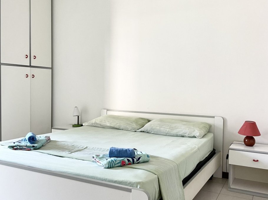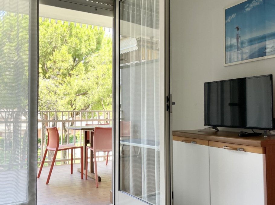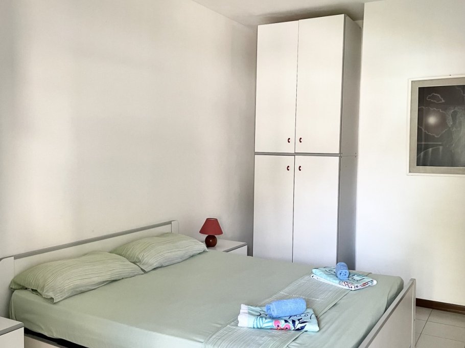 Apartment on 3th floor with one spacious double bedroom, one bedroom with 2 beds, living room with sleeping sofa and cooking area, bathroom with shower box, balcony with view on the pool, air conditioned (on demand € 50,00 for week), television, reserved parking place for 1 car standard.