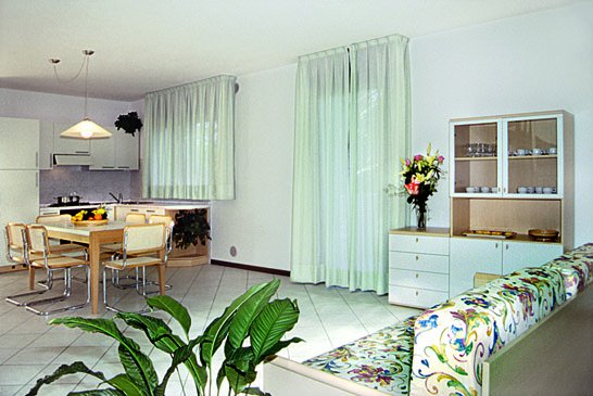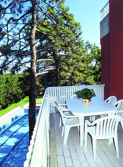 A small, modern two-story residence that rises in the middle of a green, pine wood-garden. It has a swimming pool for adults and one for children, playground, parking area, loundry room with washing machines and driers, working with coins. The residence is located at 150 metres from the sandy beach and not so far from the center of Lignano Sabbiadoro. Minimarkets, supermarkets and bakery are nerby. The apartmets are confortable and practical, with spacious rooms, bright and coloured furniture. All balconies are furnished with outdoor tables overlooking the garden.