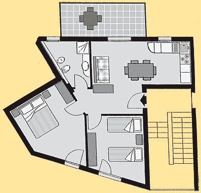 Roomy apartment of 52 smq on the ground floor and first floor of the residence. Living room with sofa-bed, kitchenette with oven, microwave, fridge and freezer. One double-bedroom, one twin room and one bathroom with shower box. access to the balcony ovelooking the garden.