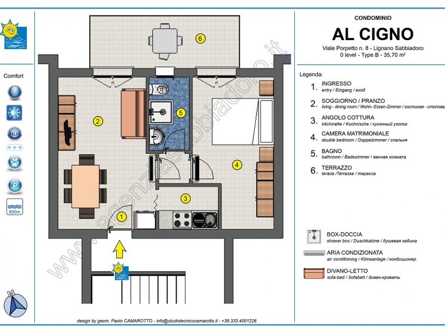 A two -roomed apartment so composed: a bed-room with a double bed-spacious living-room with a divan-bed,a little separate kitchen.a bath-room with window and shower,great terrace,reserved parking place.