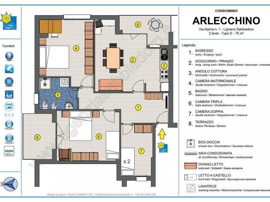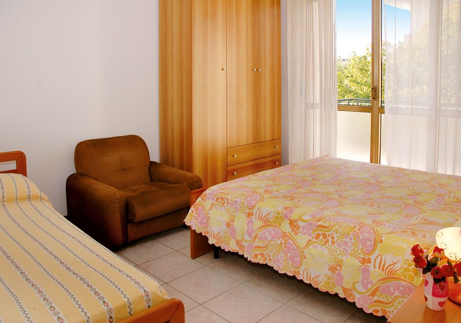 Spacious apartment with two terraces,so composed:a bed-room with a double-bed,a bed-room with three beds,a bed-room with a bunk-bed,great living-room with bed-divan,a bath-room with window and shower!