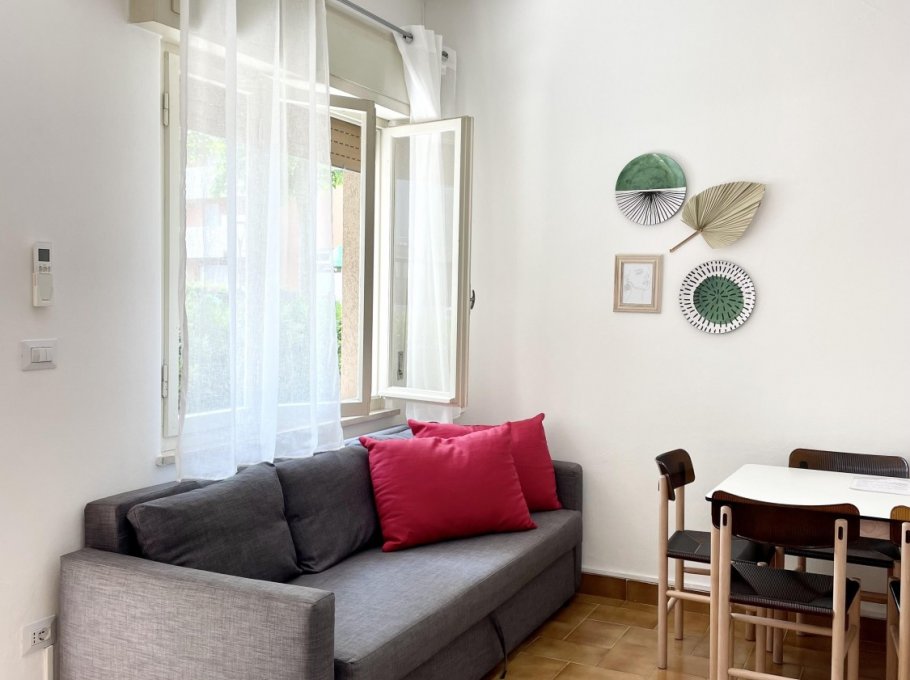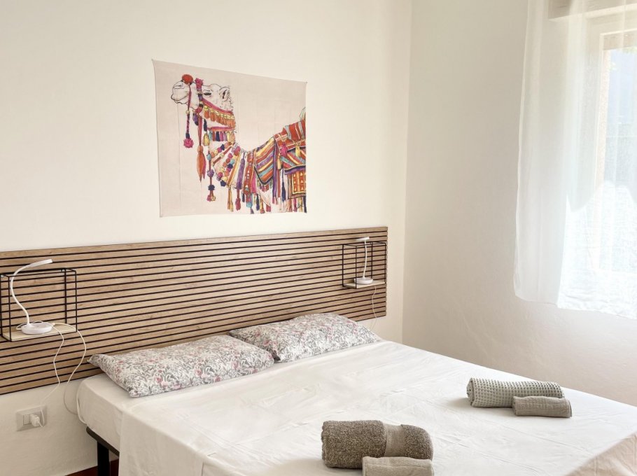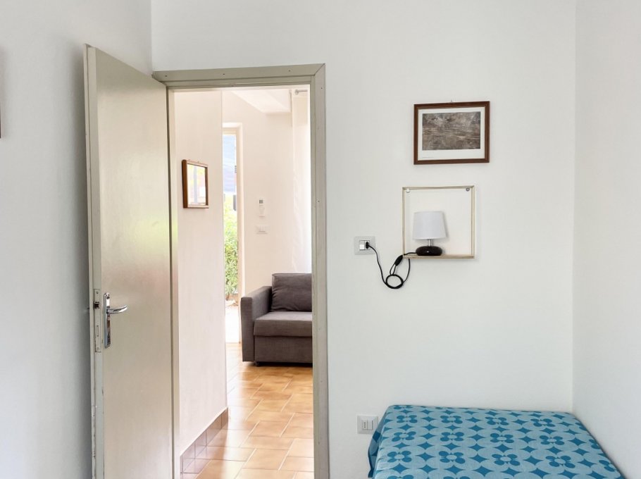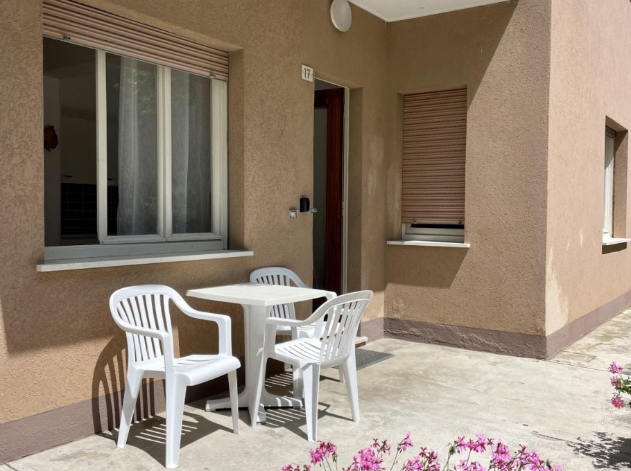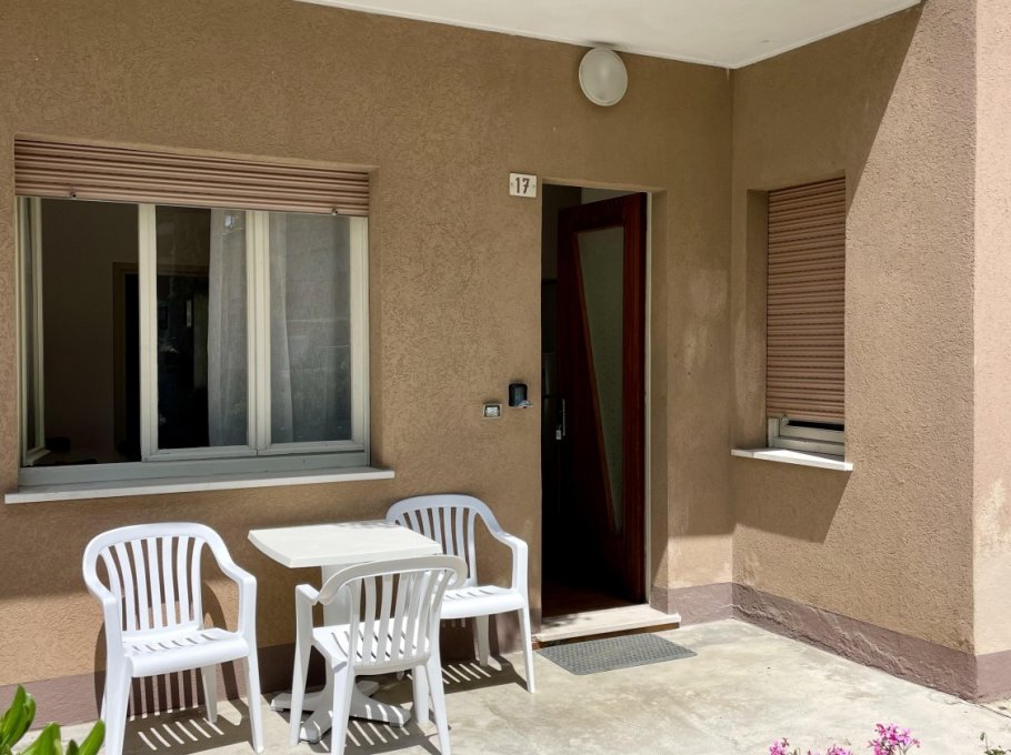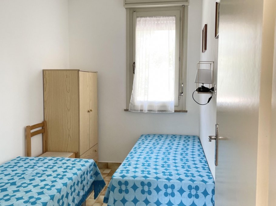 Appartamento al piano terra con aria condizionata composto da soggiorno con divano letto doppio, angolo cottura, tv, camera con letto matrimoniale, cameretta con 2 letti singoli, bagno con doccia e finestra. Patio esterno e parcheggio numerato