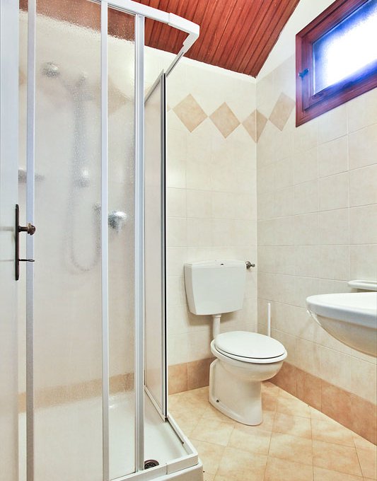 Houses type D1: three-family houses with at the ground floor big living room with double divan bed and direct access to the patio with fireplace, kitchen with direct access to the garden, windowed bathroom with box shower. At the first floor: big double bedroom with terrace, 1 big bedroom with 2 single beds, 1 bedroom with bunk bed,and terrace, windowed bathroom with shower (6/8 sleeping places).