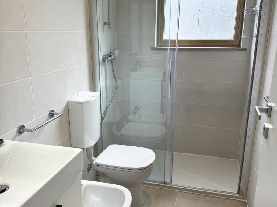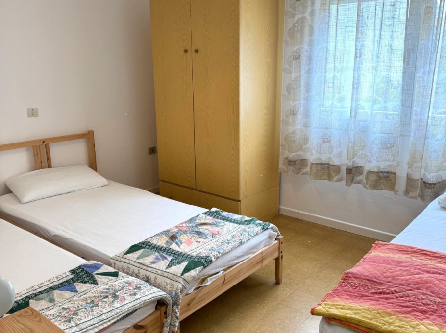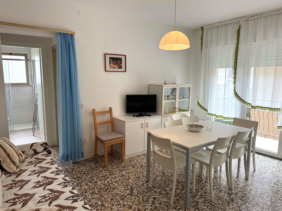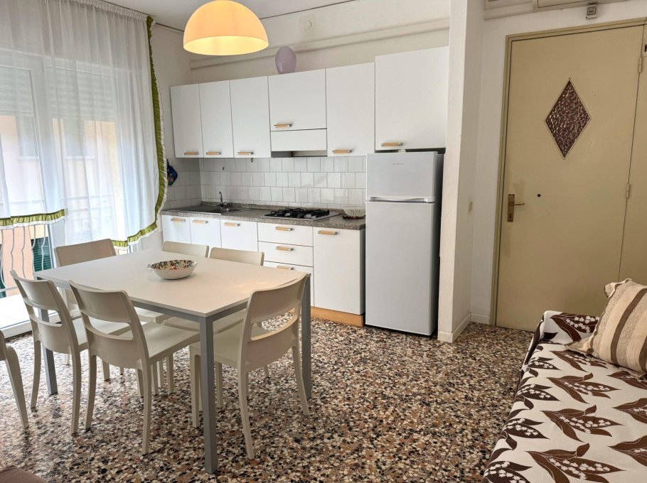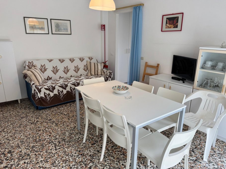 Apartment in a small building, located in a quiet street near the church of Sabbiadoro about 150 meters from the sea. It is on the first floor and consists of a large bedroom with three beds, living room with kitchenette and double sofa bed, bathroom with shower box new from 2025 with window, terrace, parking space and air conditioning. The windows were also new in 2025