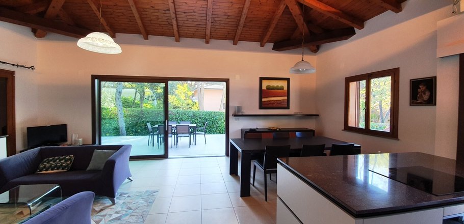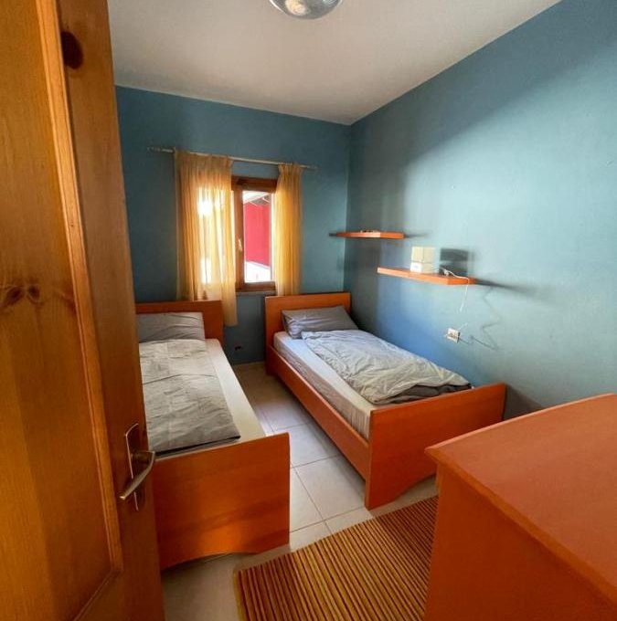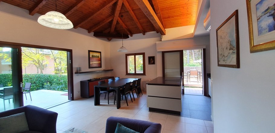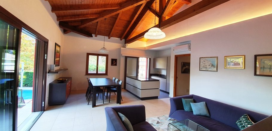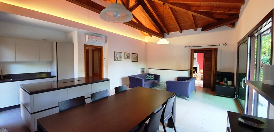 villa singola con giardino e piscina in uso esclusivo. La casa si compone di un appartamento padronale con un ampio soggiorno con cucina a vista, una camera matrimoniale con bagno, una seconda camera matrimoniale, una camera con due letti singoli, bagno, terrazze. Un secondo appartamento composto da soggiorno, cucina, una camera matrimoniale, una camera con due letti singoli, bagno. Gli appartamenti sono dotati di lenzuola ed ascigamani