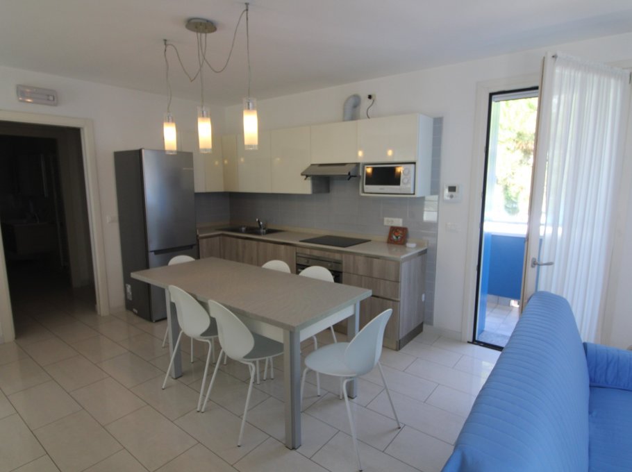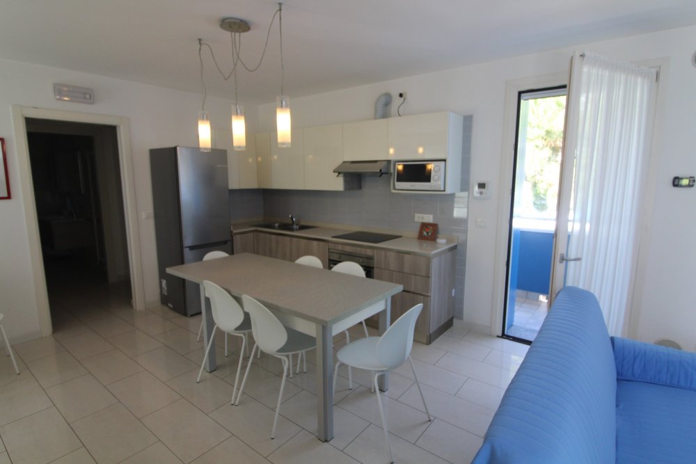 Type E1: on the upper floor spacious and luminous living/dining room with open space kitchen, 1 bathroom with shower/WC, 1 double bedroom, 1 bedroom with 2 single beds, terrace; on the ground floor 2 light and friendly bedrooms each with 2 single beds, 1 bathroom with shower/WC, big terrace, garage and laundry. Flat roof with solarium. For 8 people. Air conditioning unit – heating. Beach service from sunday to friday (1 sun umbrella, 1 sun chair and 1 sun bed) provided on request and subject to availability. Stays from Sunday to Sunday. Energy class B (90.52 kWh/sq m year). CIN: IT030049C2YF4GUTF4