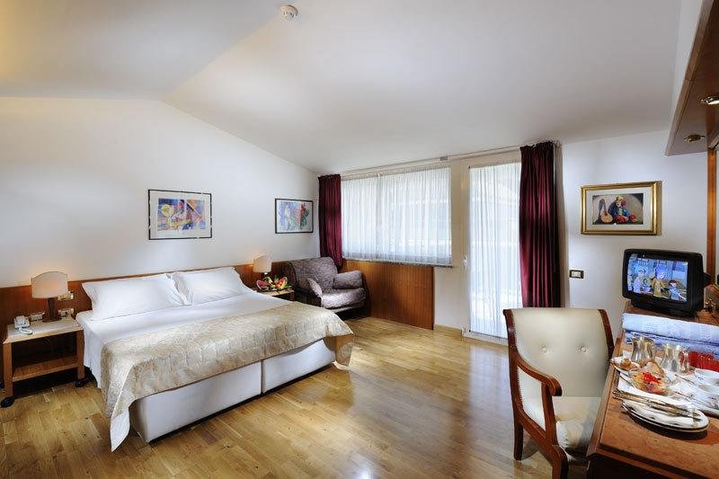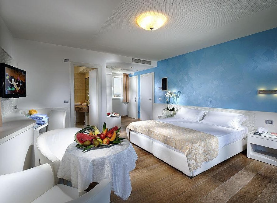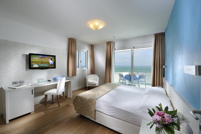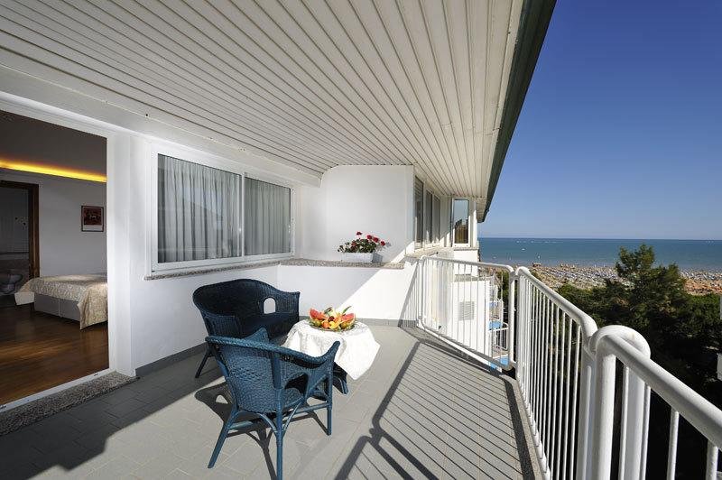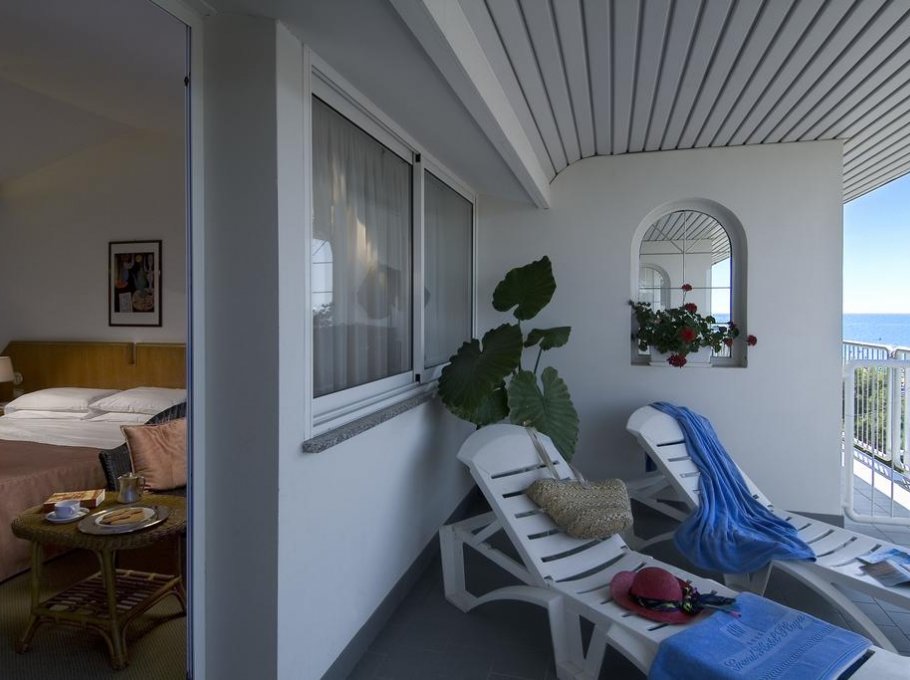 Room with double bed or two single beds (and possibly also baby cot), with warm colors and light furniture, flooring parquet wood, bathroom with shower, toilet and bidet , hairdryer, mini-bar with free drinks, safe, telephone, satellite TV with international channels, wi-fi, radio, air conditioning and a terrace overlooking the sea with direct or lateral sea view.