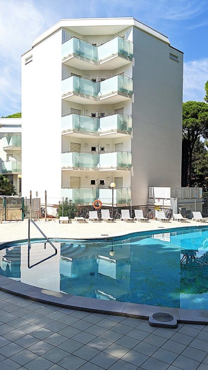 Holiday complex composed of 2 different buildings on 4 floors, located in a quiet and verdant area, about 250 m from the beach. Spacious hall with reception, lifts, large swimming-pool and 1 numbered parking-place for each apartment. Apartments with balcony and television.