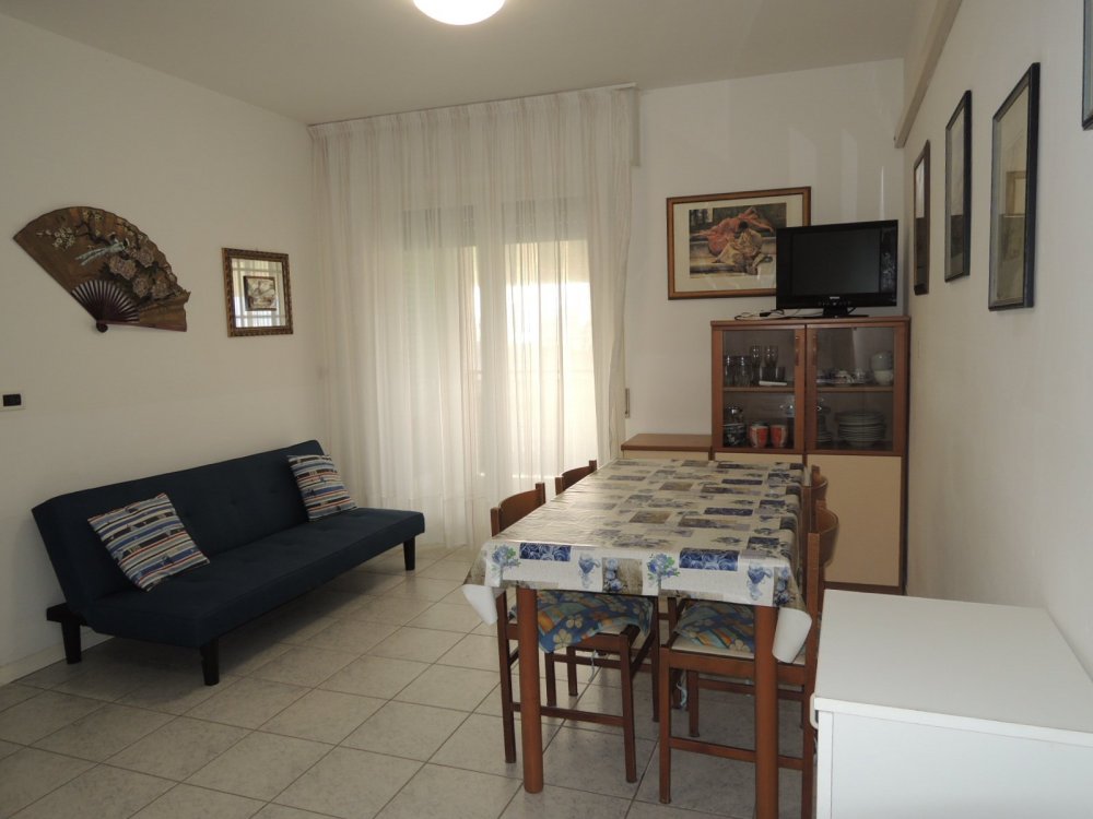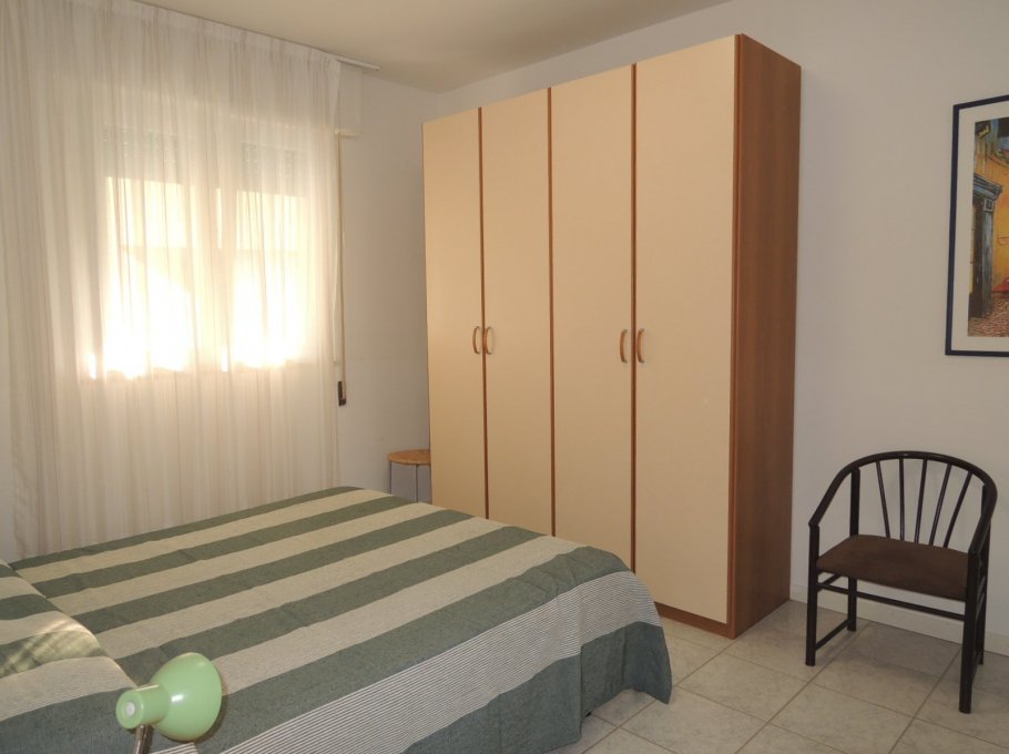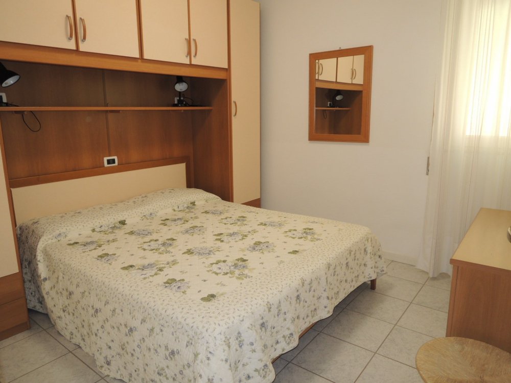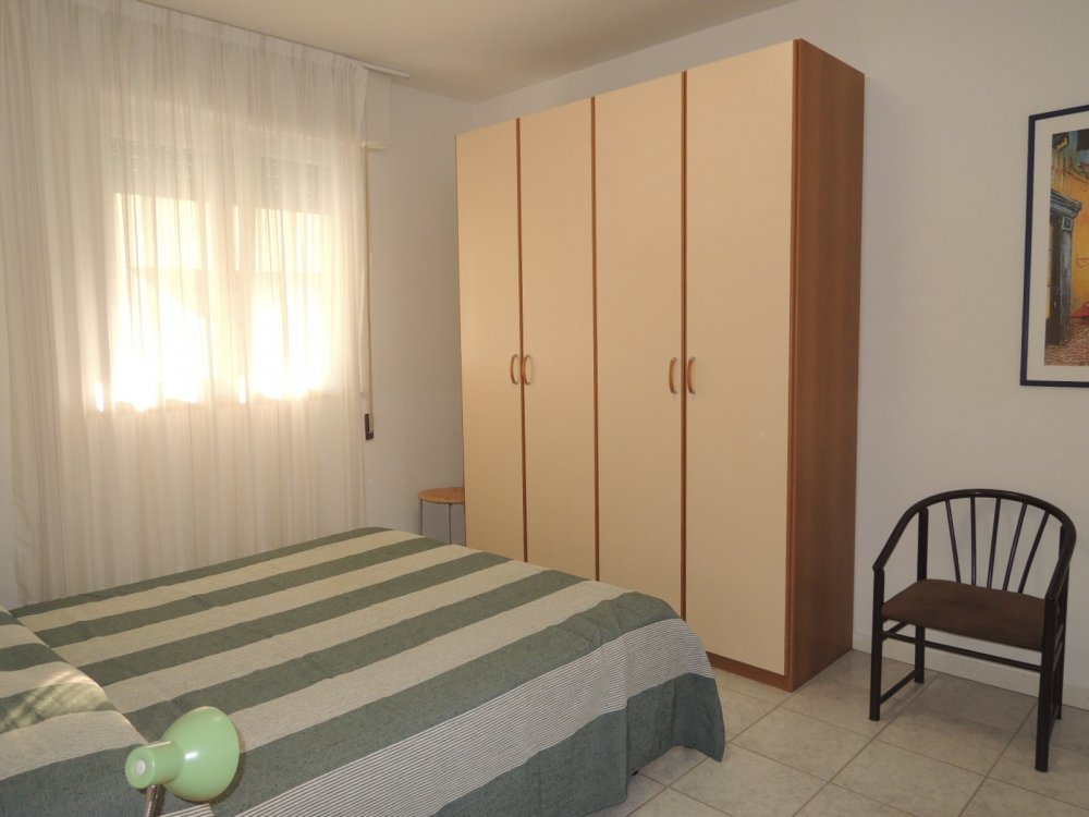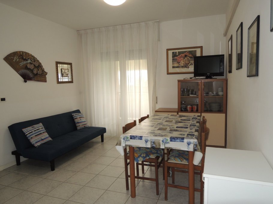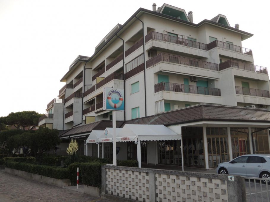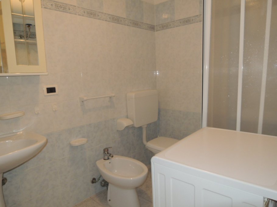 This beachfront building is located on the beautiful Lungomare Marin promenade. The apartment is on the 5th floor and faces northeast. It comprises two double bedrooms, a living room with kitchenette, a bathroom with shower (without window), and a terrace with partial sea views. A washing machine and air conditioning are included in the price. The shared parking space is unnumbered.
