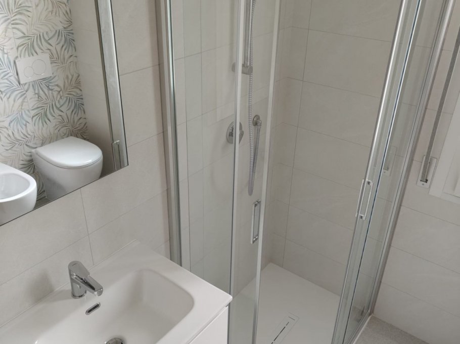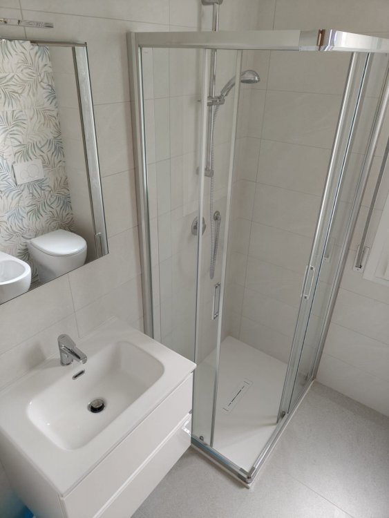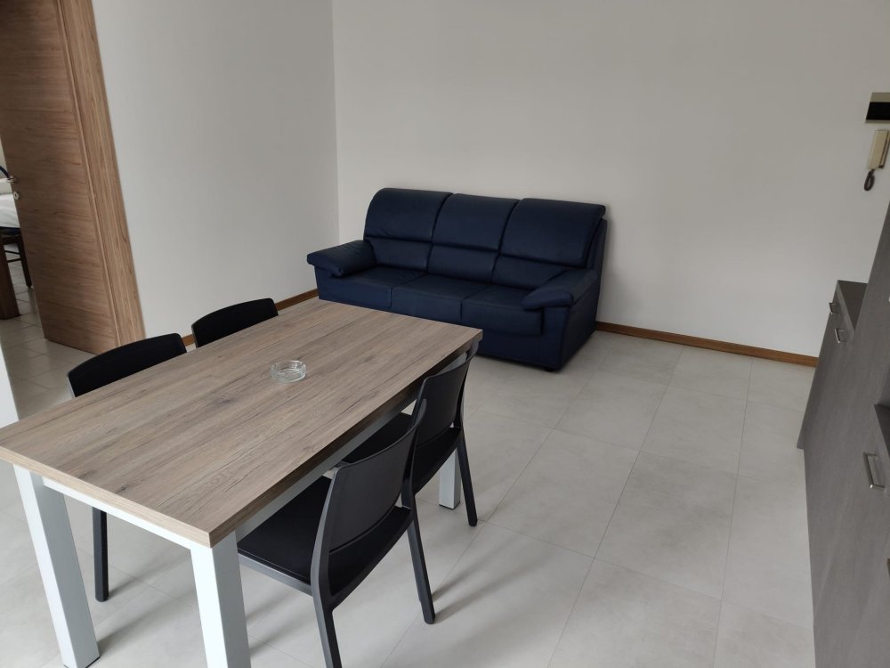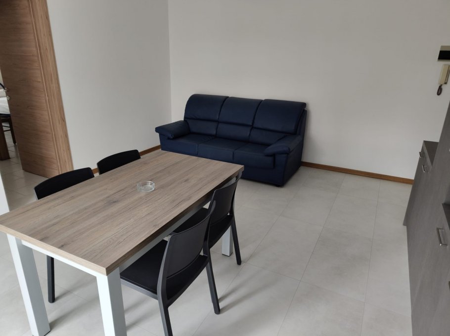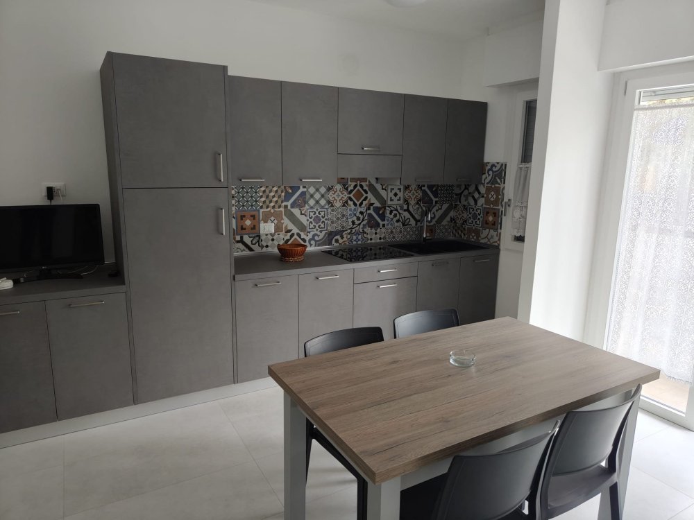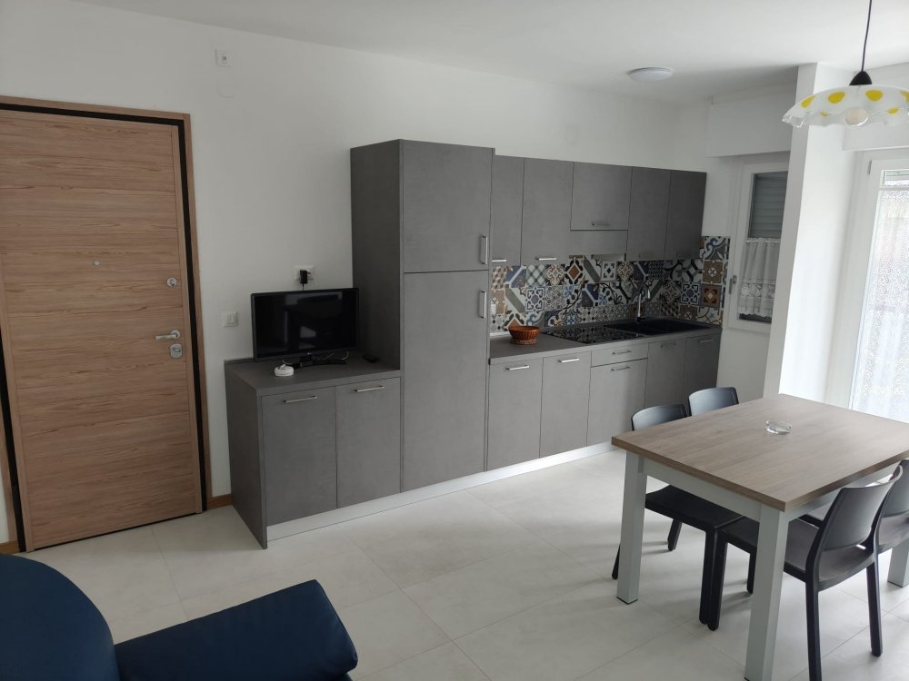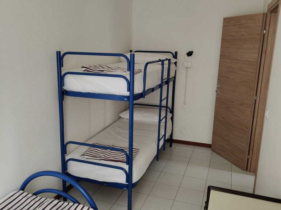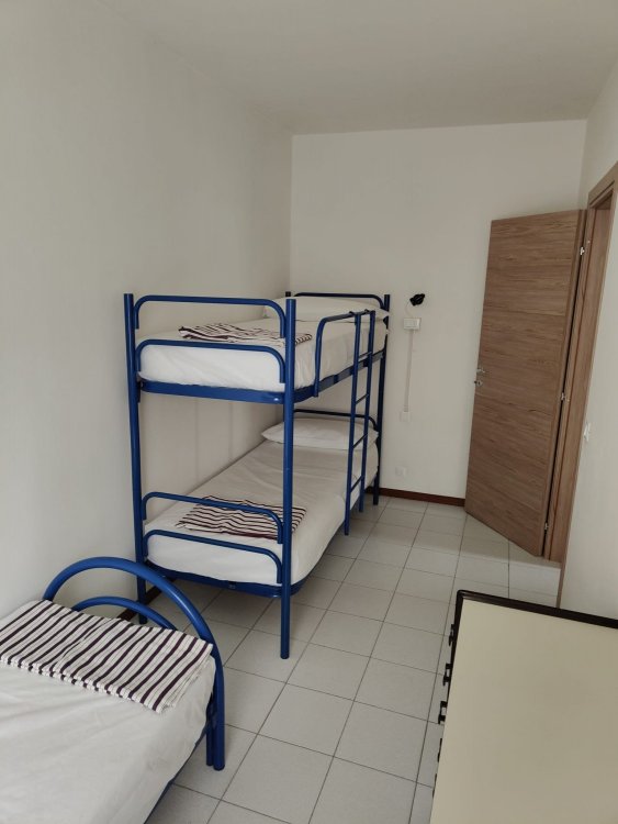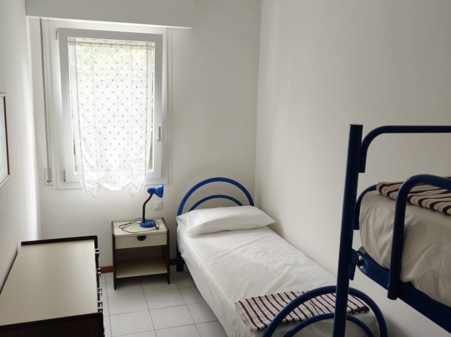 Cozy first-floor apartment, ideal for families. It features a double bedroom, a bedroom with bunk beds plus a third bed, a living room with sofa, a fully equipped kitchen, and a bathroom with shower.