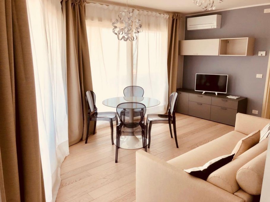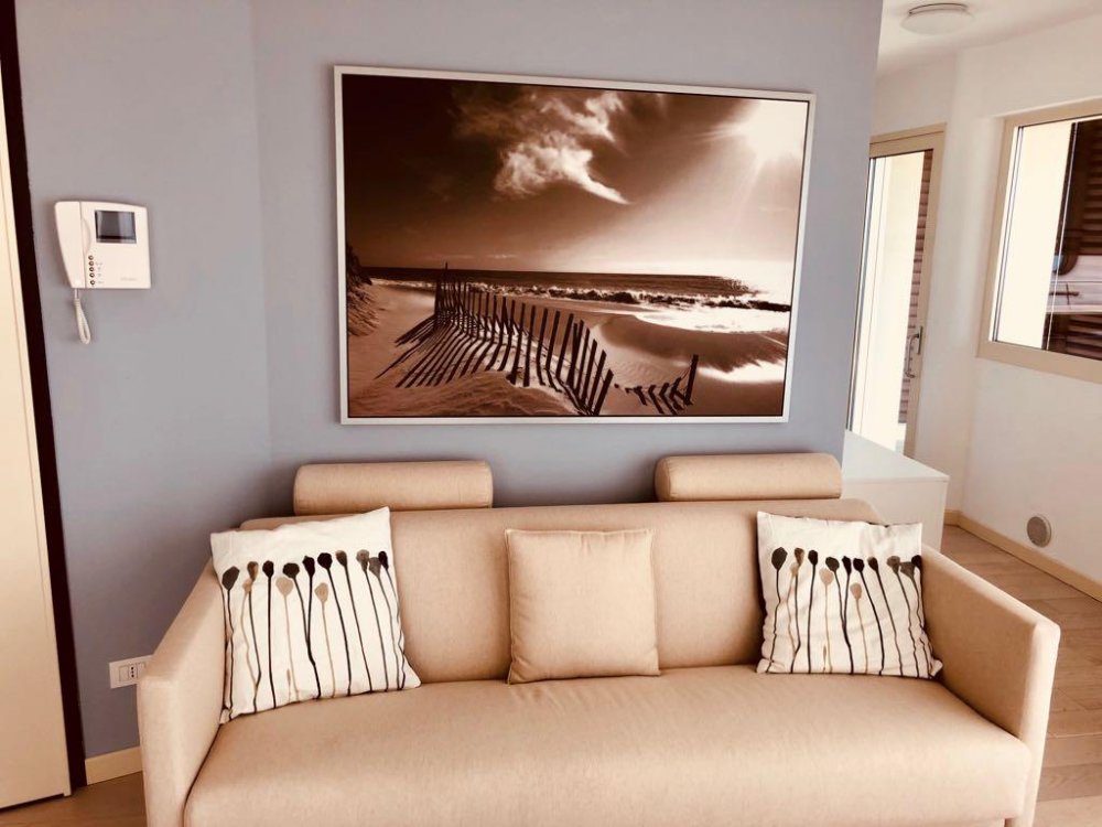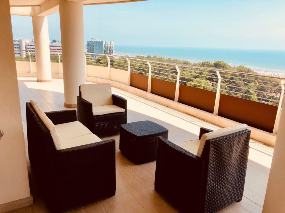 The Shiva tower is a new modern residence with balcony with 360° panoramic view, 10 floors, 1 lift and private-parking. This apartment is on the 9° floor and is located only 50 mt. to the beach promenade, near to the center of Lignano Sabbiadoro.