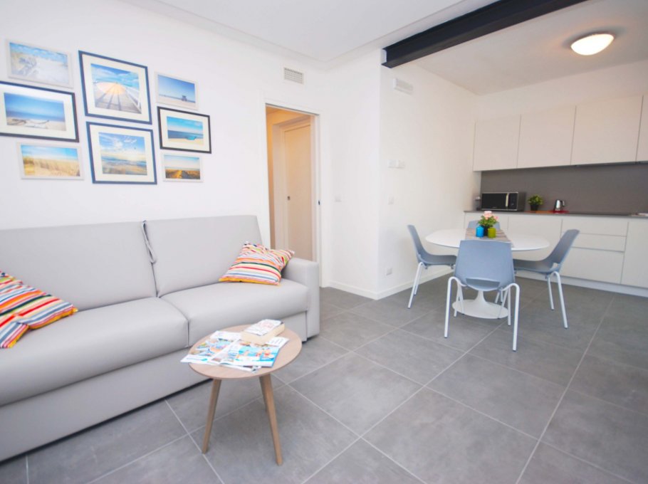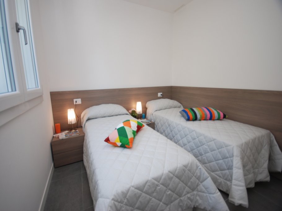 TIPO C-6: TRILOCALE con 6 posti letto composto da soggiorno con divano letto doppio, 1 camera a matrimoniale , 1 camera con 2 letti singoli, angolo cottura, bagno, terrazzo, parcheggio nelle vicinanze . Aria condizionata, riscaldamento. Prima fornitura di lenzuola e asciugamani inclusa.