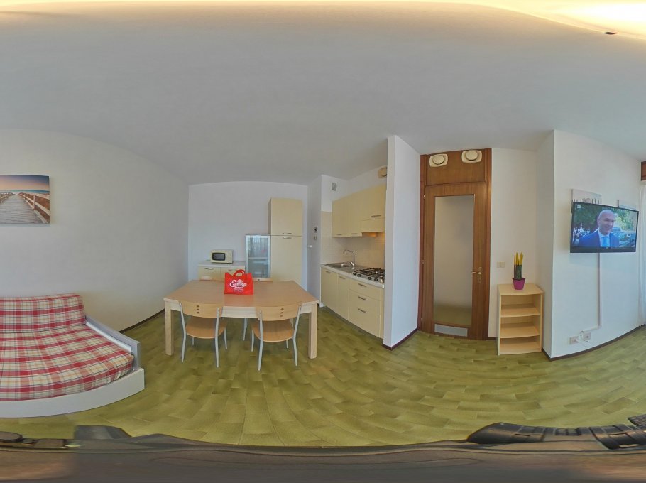Bilocale composto da un soggiorno con angolo cottura e doppio divano letto, tv e microonde, camera da letto matrimoniale, bagno con box doccia/bidet/wc e balcone arredato.