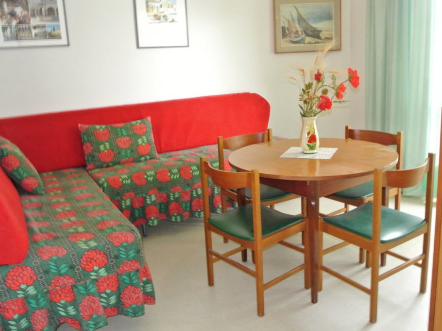 Condominio frontemare a Lignano Sabbiadoro, a pochi passi dalla Terrazza a Mare, con ascensore e parcheggio condominiale ad esaurimento. Appartamento al 4° piano, composto da: soggiorno con nuovo angolo cottura e divano letto doppio - 1 camera matrimoniale - 1 bagno con doccia - terrazzo con parziale vista mare dotato di tavolo e sedie - aria condizionata (l' uso dell' aria condizionata è a richiesta ed a pagamento)