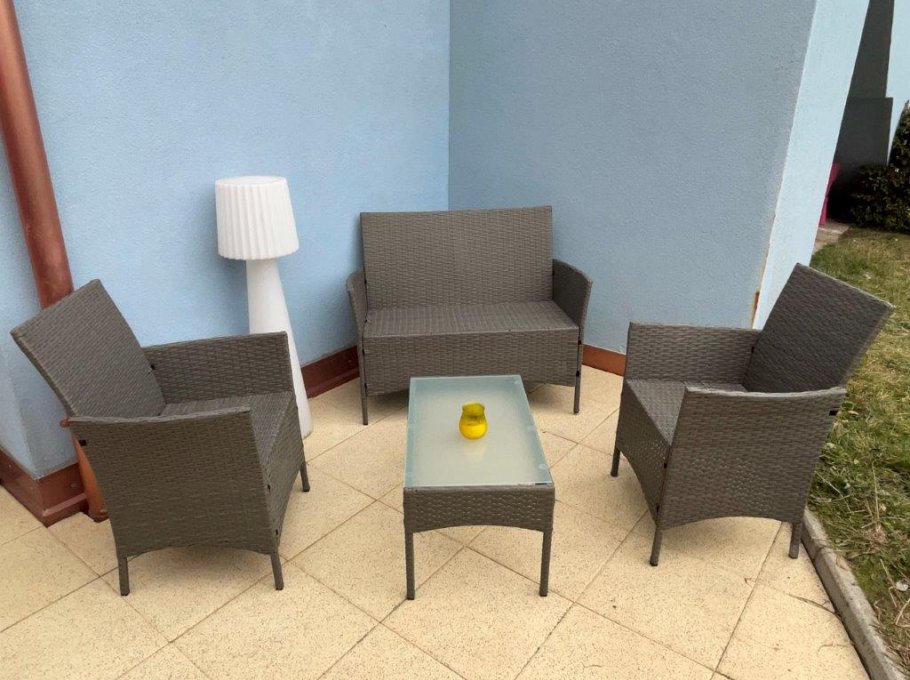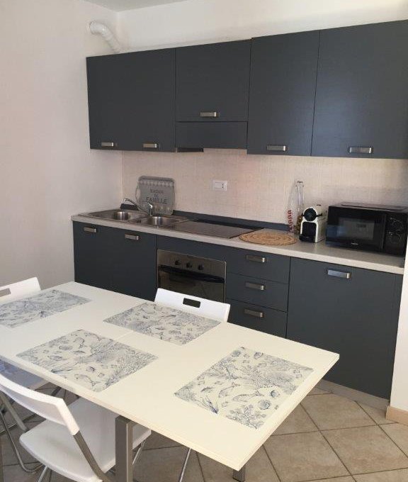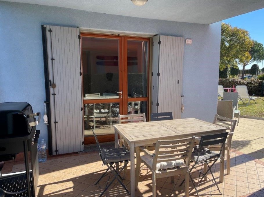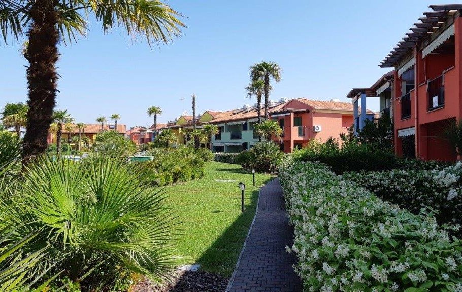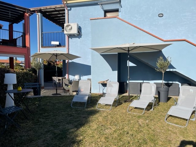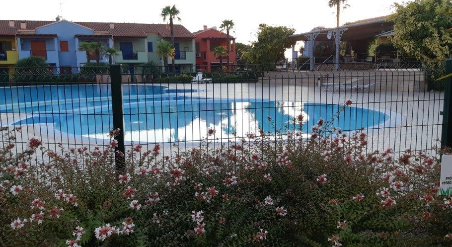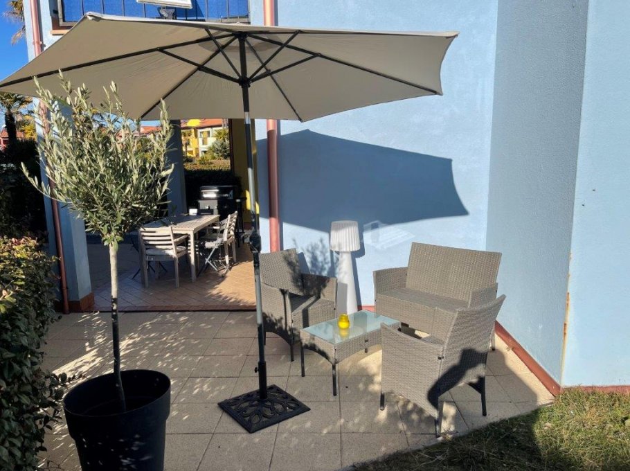 Appartamento trilocale d'angolo al piano terra con giardino recintato. Si compone di: soggiorno con angolo cottura, camera matrimoniale, cameretta con letto a castello, bagno terrazzo, piscina e parcheggio.