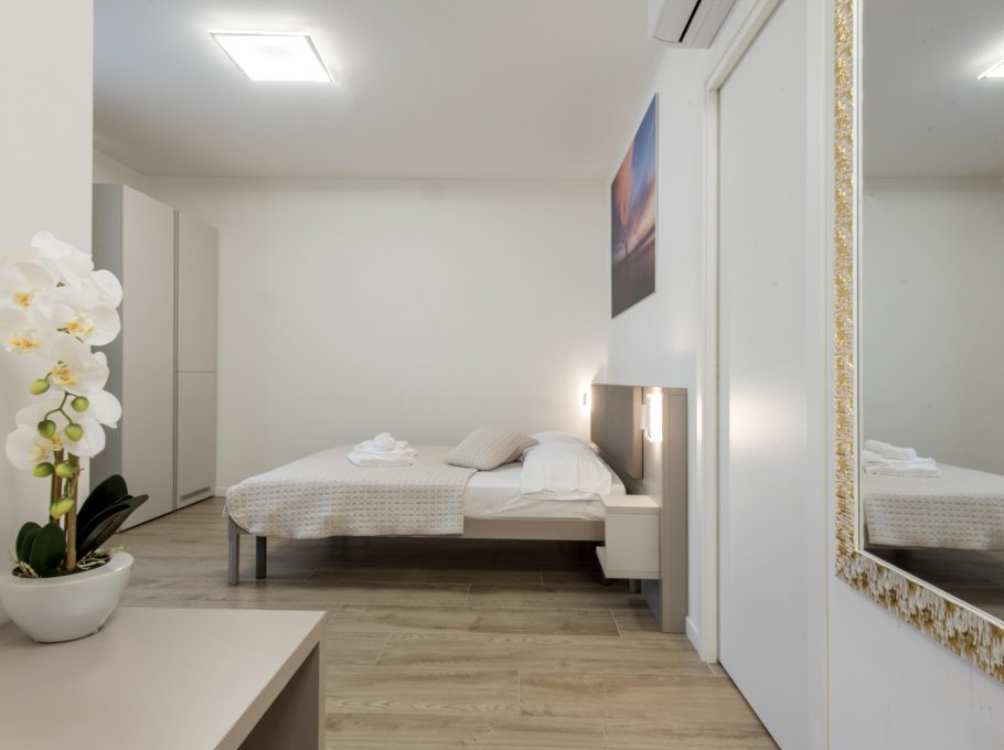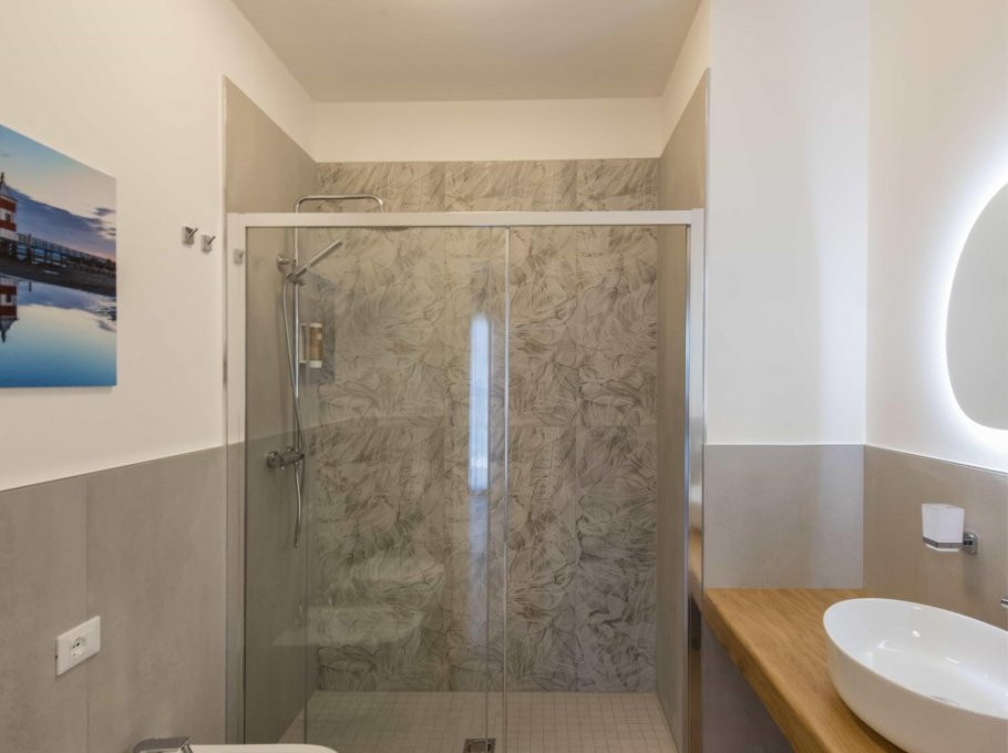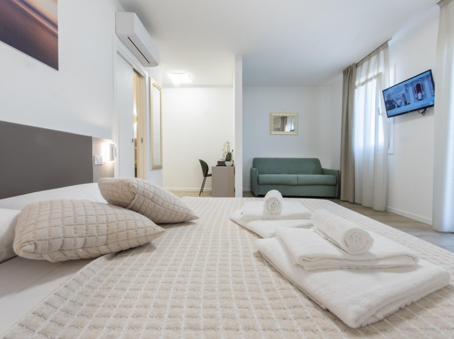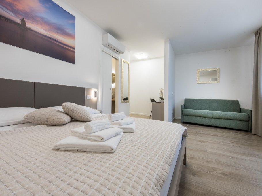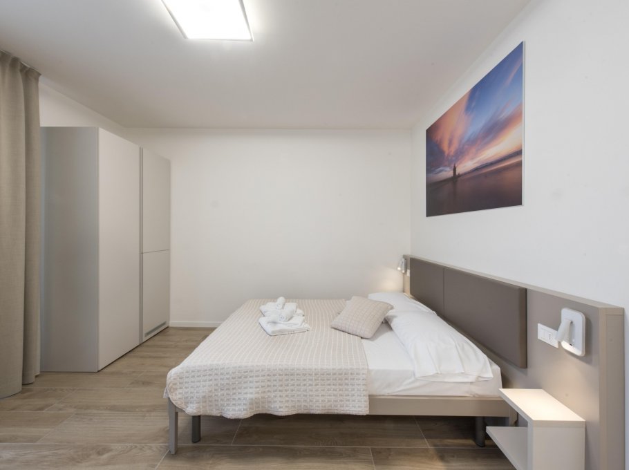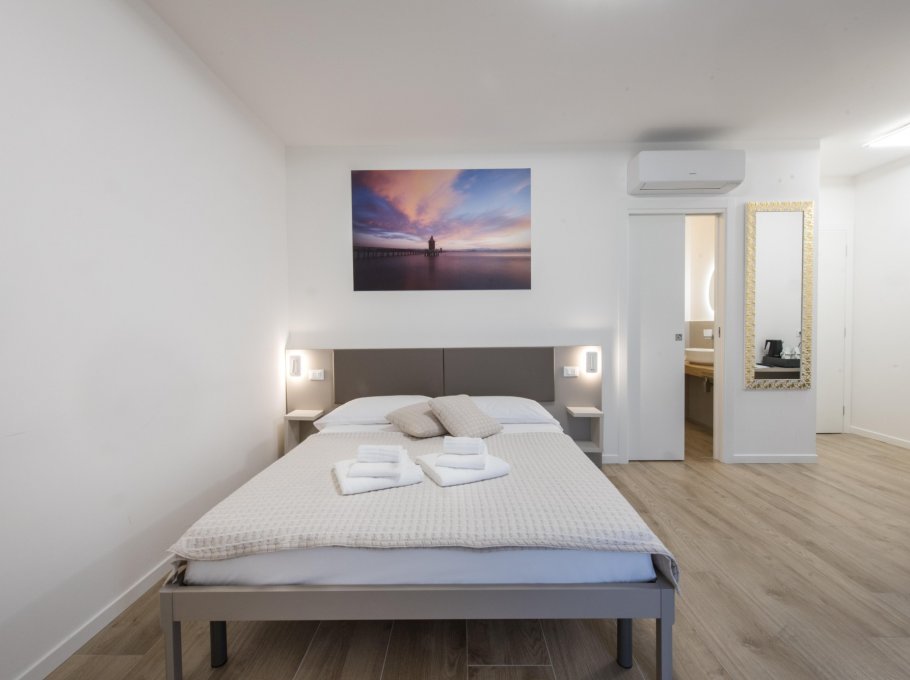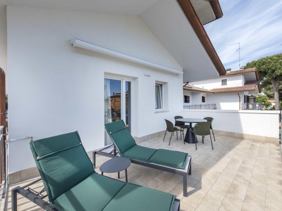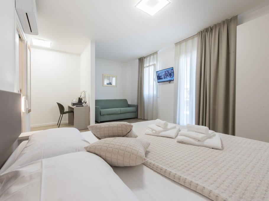Camera family per 4 persone, ristrutturata e dotata di ogni confort. Letto matrimoniale, armadio e scrivania con bollitore e macchina caffè Nespresso, ampio bagno con spazioso box doccia e kit di cortesia. Lenzuola e asciugamani. Spaziosa terrazza solarium attrezzata con tavolo, sedie e due sdraio.