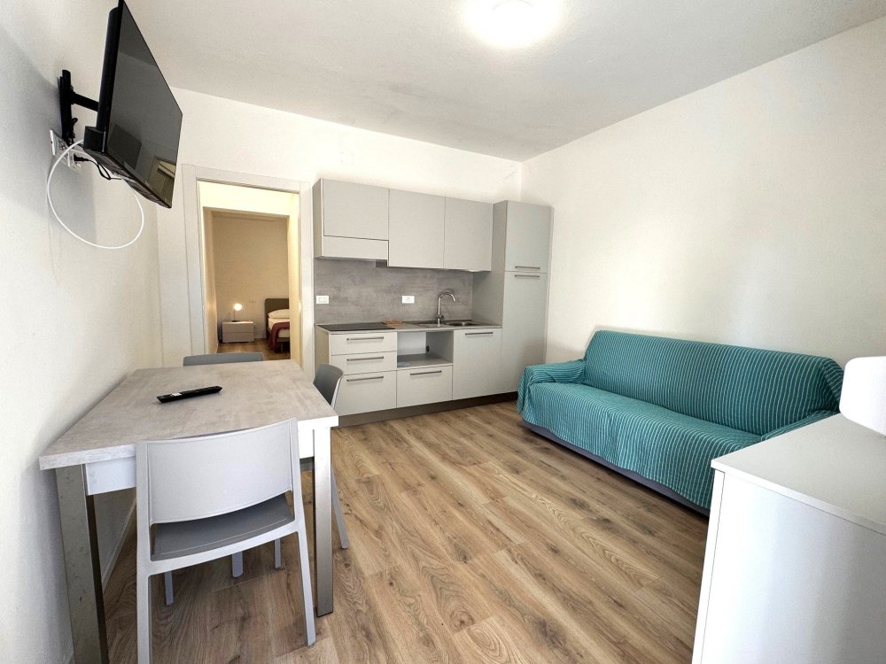 Appartamento nella palazzina all'interno al piano terra, completamente ristrutturato, composto da soggiorno (dove c’è un divano letto) con angolo cottura a induzione, camera da letto matrimoniale, bagno con box doccia; l’appartamento ha inoltre l’aria condizionata ed un piccolo spazio esterno attrezzato con tavolo e sedie; con posto auto nel cortile