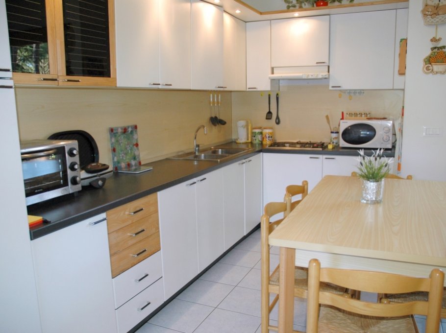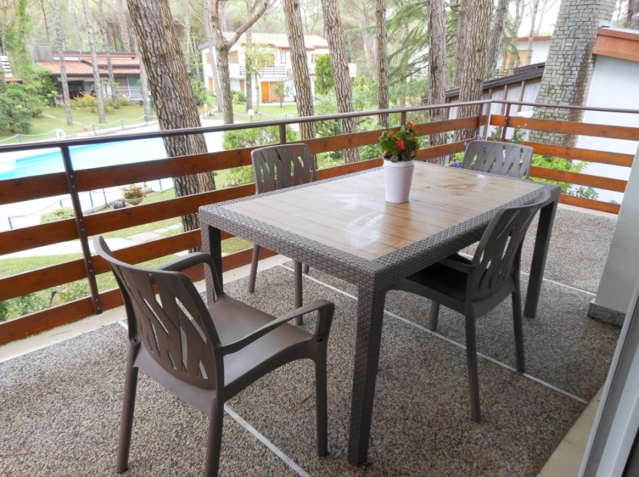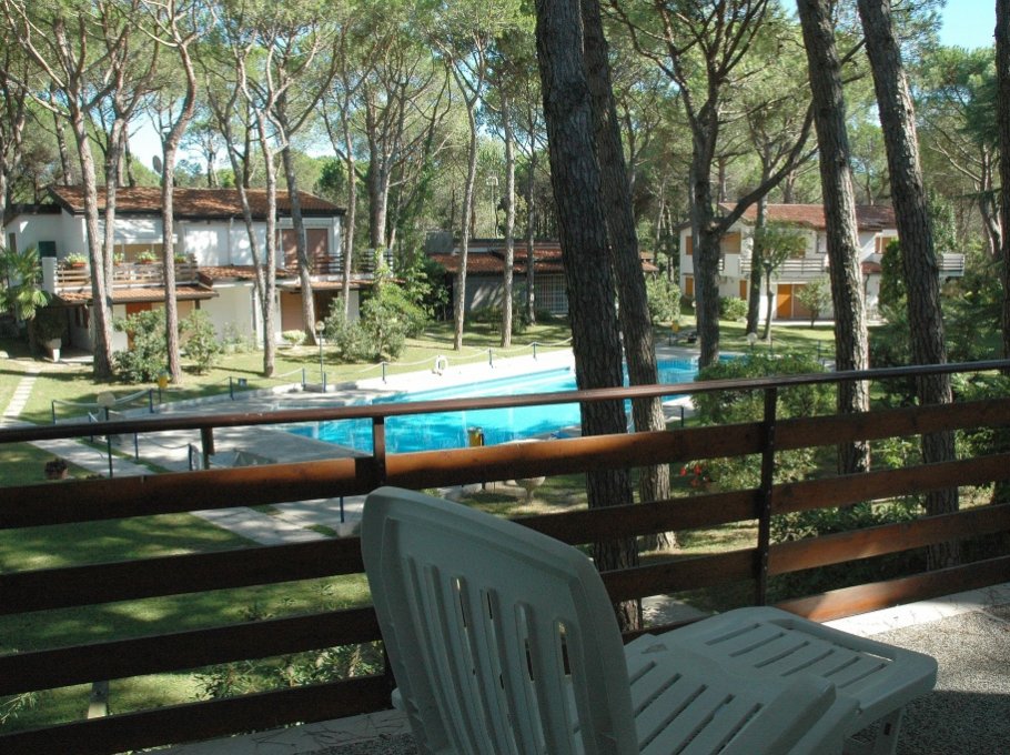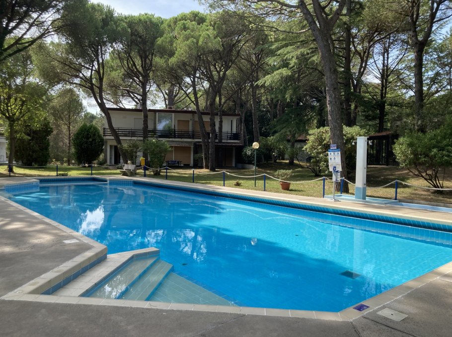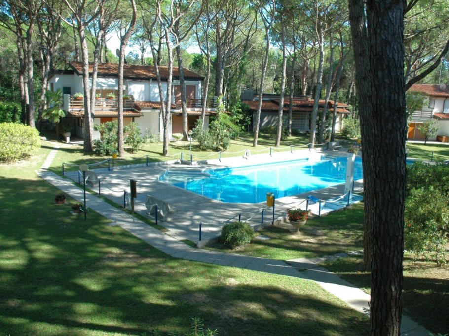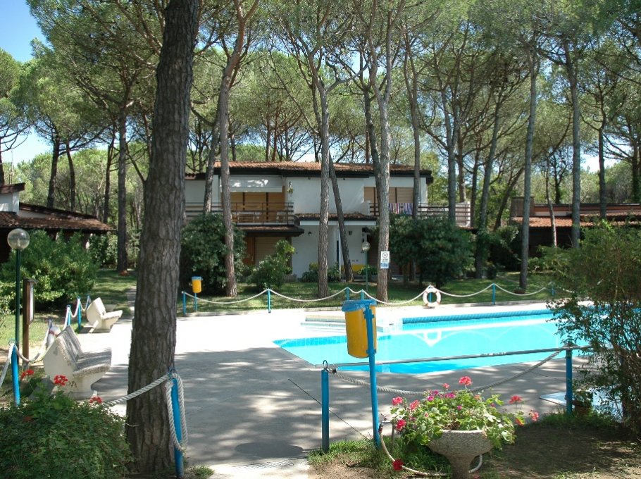 Curato residence di appartamenti in villette, immerso in un parco di pineta naturale, in zona tranquilla, a Lignano Riviera, con custode, piscina per adulti e per bambini (aperta indicativamente dai primi di giugno a metà settembre) parcheggio, a ca. 800m dalla spiaggia. Le foto sono indicative.