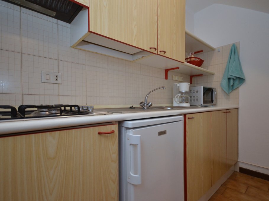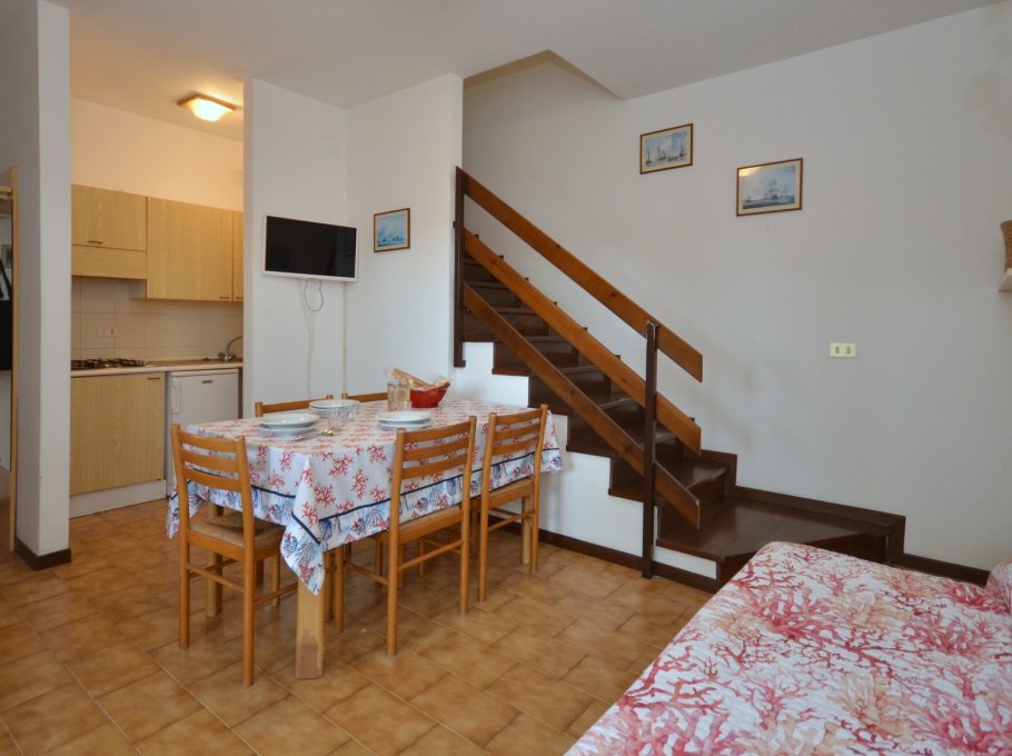 TWO-ROOM-APARTMENT for 3-5 persons, on 2 LEVELS, composed of: living-room with double divan-bed, kitchen corner, terrace, on the GROUND LEVEL. 1 bedroom with double bed and single bed, bathroom, balcony, on the FIRST FLOOR.