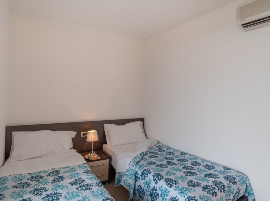 THREE-ROOM-APARTMENT for 4-6 persons composed of: living-room with double divan-bed, 1 bedroom with double bed and bathroom, 1 bedroom with 2 single beds, kitchen-corner, washing-machine, bathroom, balconies. Firstsupply bed linen and towels included.