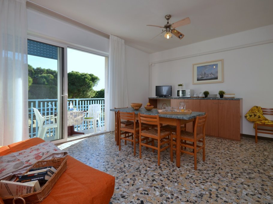FOUR-ROOM-APARTMENT for 5-7 persons composed of: living-room with double divan-bed, 1 bedroom with double bed, 1 bedroom with 2 joinable beds, 1 bedroom with single bed, kitchen corner, bathroom, balcony. Reserved parking-place (width approx 1,90 cm)