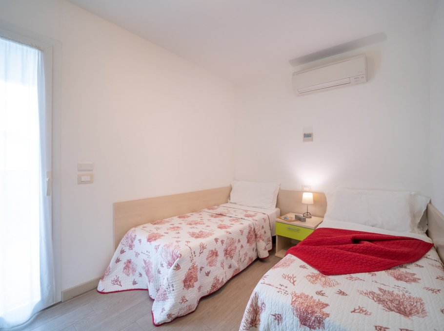 THREE-ROOM-APARTMENT for 4-6 persons composed of: living-room with double divan-bed, 1 bedroom with double bed, 1 bedroom with 2 single beds, kitchen corner, washing-machine, bathroom with chromotherapy, balcony. First supply bed linen and towels included.