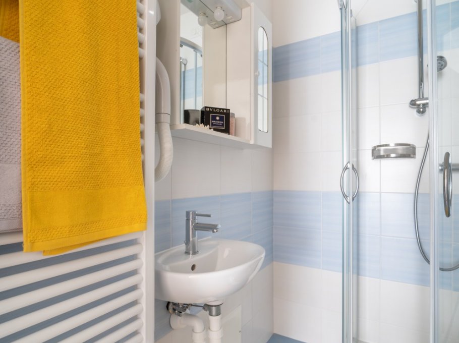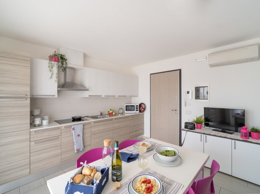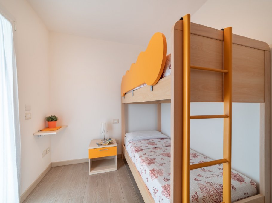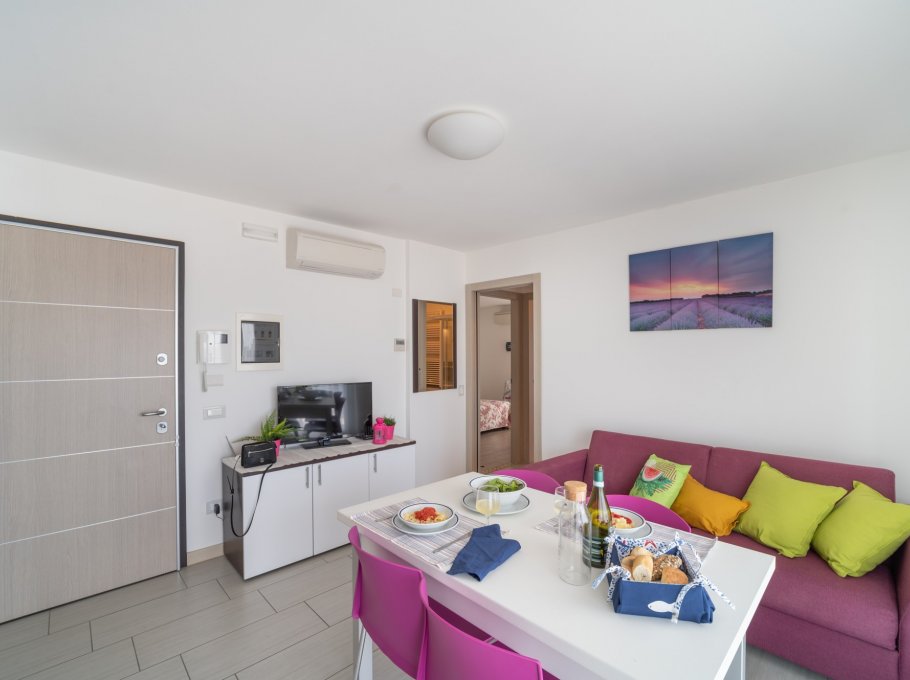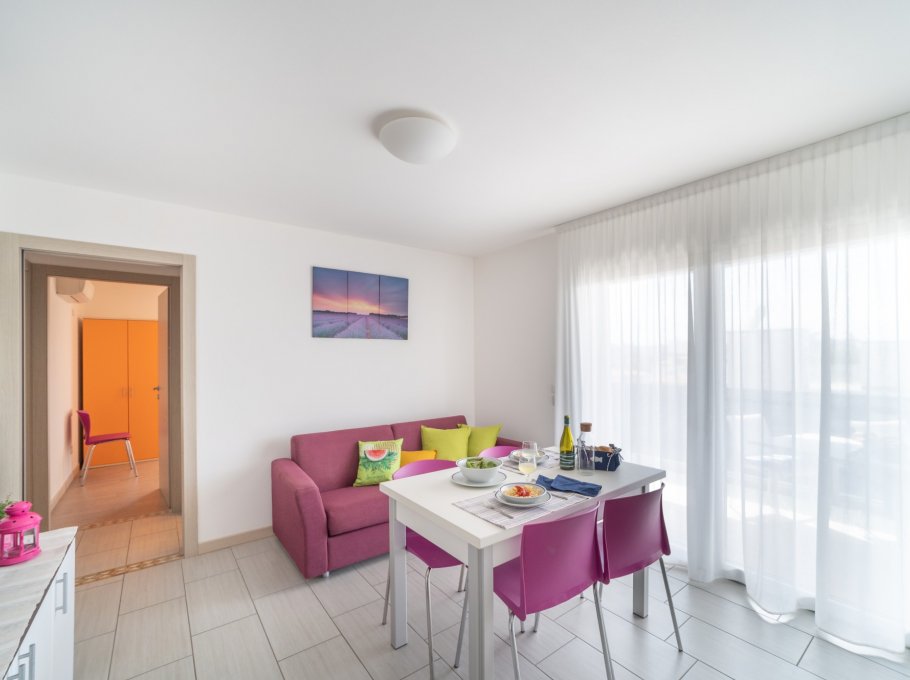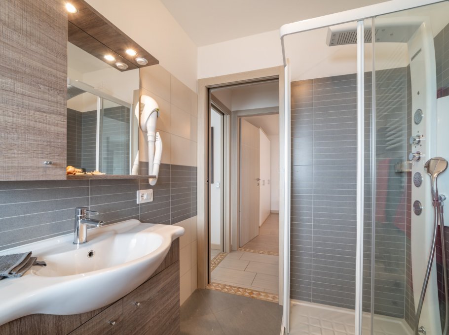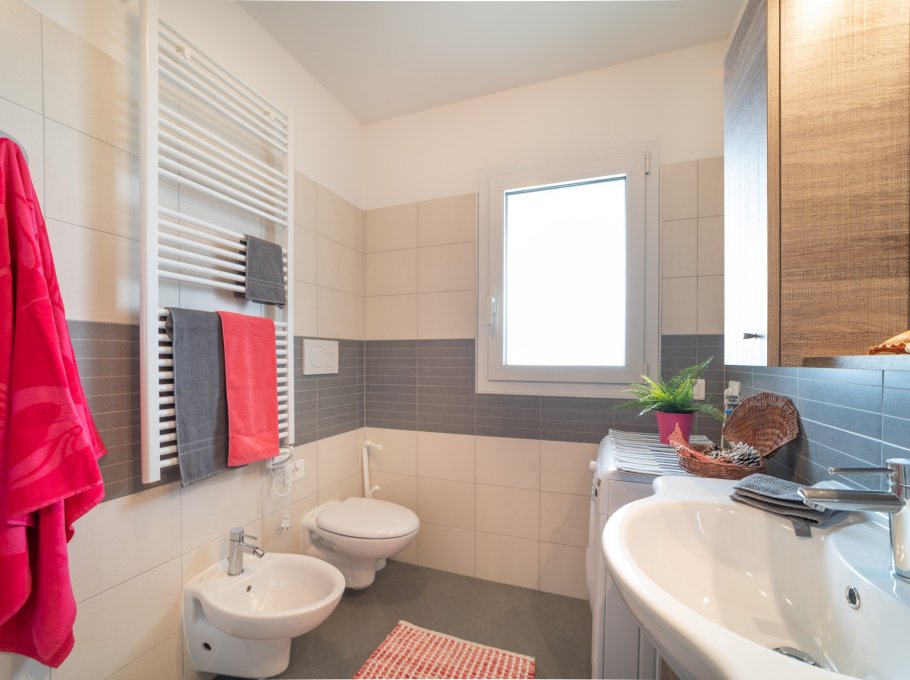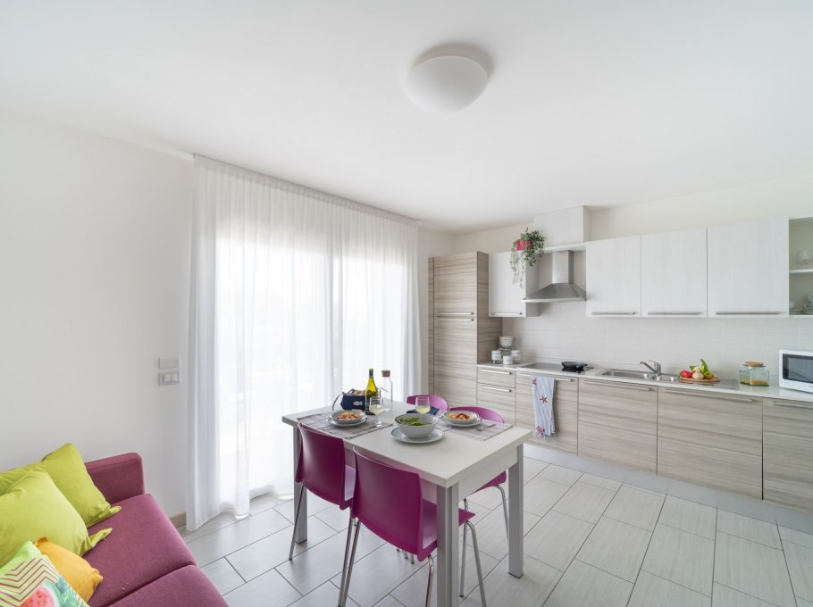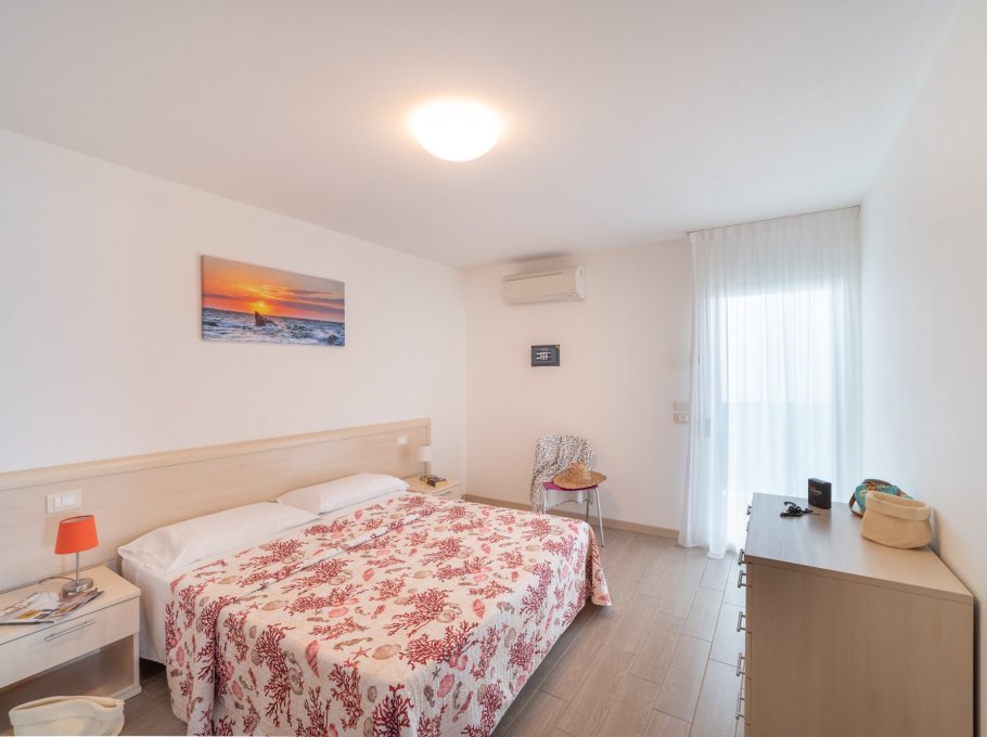 THREE-ROOM-APARTMENT for 4-6 persons composed of: living-room with double divan-bed, 1 bedroom with double bed, bathroom with entrance from the double bedroom, 1 bedroom with bunk-bed, kitchen corner, washing-machine, bathroom with chromotherapy, balcony. First supply bed linen and towels included.