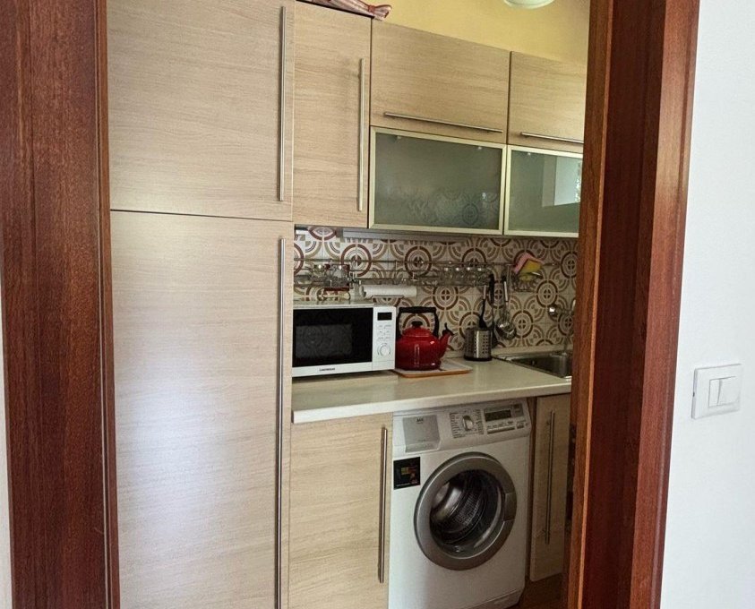 The property consists of 1 double bedroom, 1 single bedroom, living room, separate kitchenette, bathroom with window and shower and shower curtain, large terrace, air conditioning, washing machine, TV.