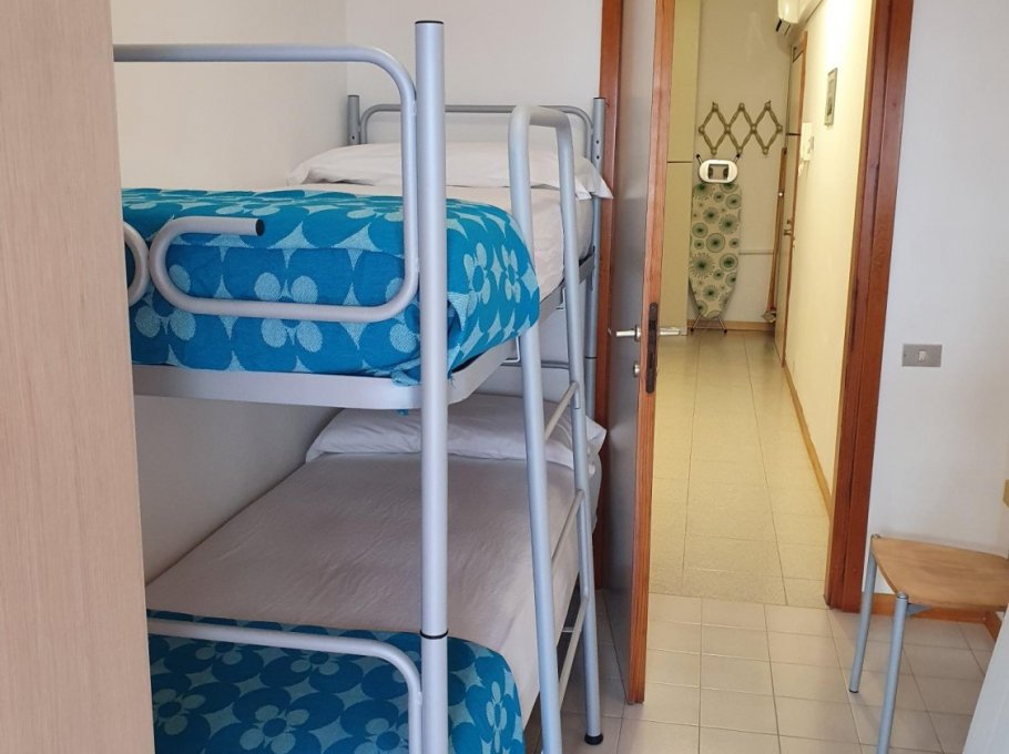 Type D: 6 persons - Apartment on the 2nd floor consists of a double bedroom, a room with two beds, a room with a bunk bed and terrace (no sea view) with table and chairs, bathroom with shower box, living room with a television with satellite connection, balcony (no sea view) and kitchenette with refrigerator from 240 lt (separate freezer) and washing machine.