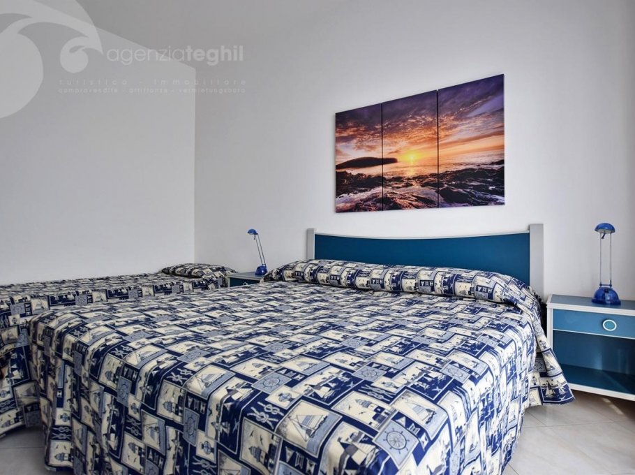 Type B 3/4 People: Renovated apartment with modern furnishings on the 10th floor (with elevator), consisting of a bedroom with a double bed and a single bed; a living room with a double sofa bed and satellite TV; a kitchenette with an induction hob, a 240-liter double-door refrigerator, and a washing machine; a large terrace with sea views and an awning, outdoor table and chairs; a windowless bathroom with a walk-in shower and an electric boiler for hot water. The apartment also features a washing machine and air conditioning.