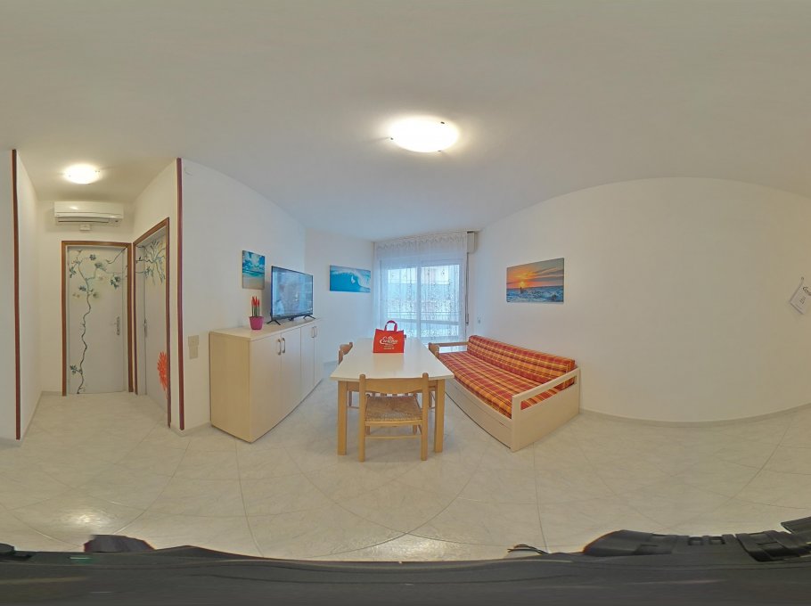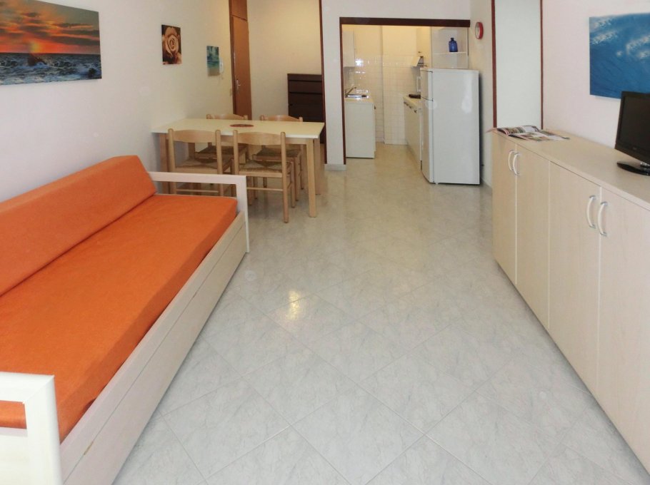 Simply furnished accomodation consisting of a living room with kitchen and double sofa bed, tv and microwave, washing machine, double bedded room, shower/bidet/wc and spacious terrace with side sea view. Air conditioning and final cleaning are included in the price. In the rental rules of the agency are mentioned all the above written service’s ways.