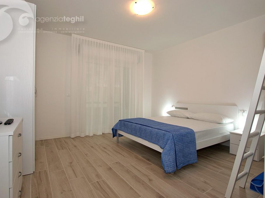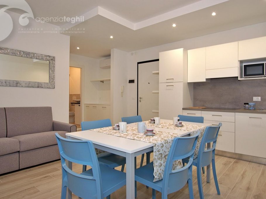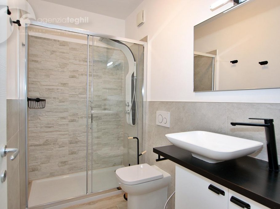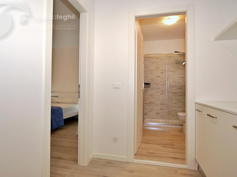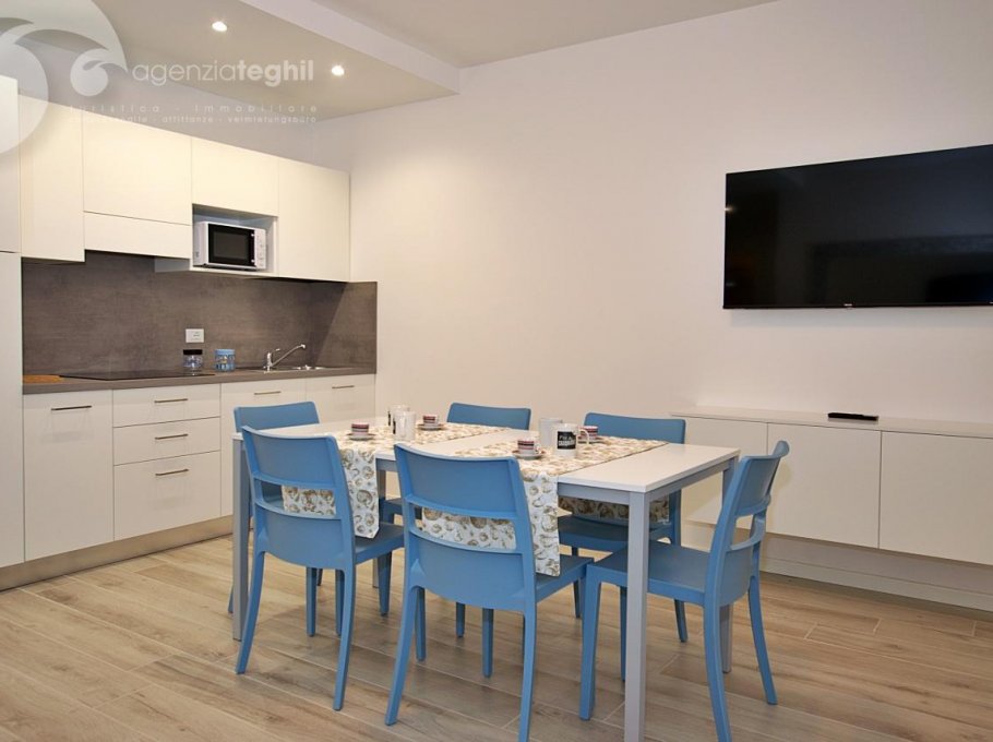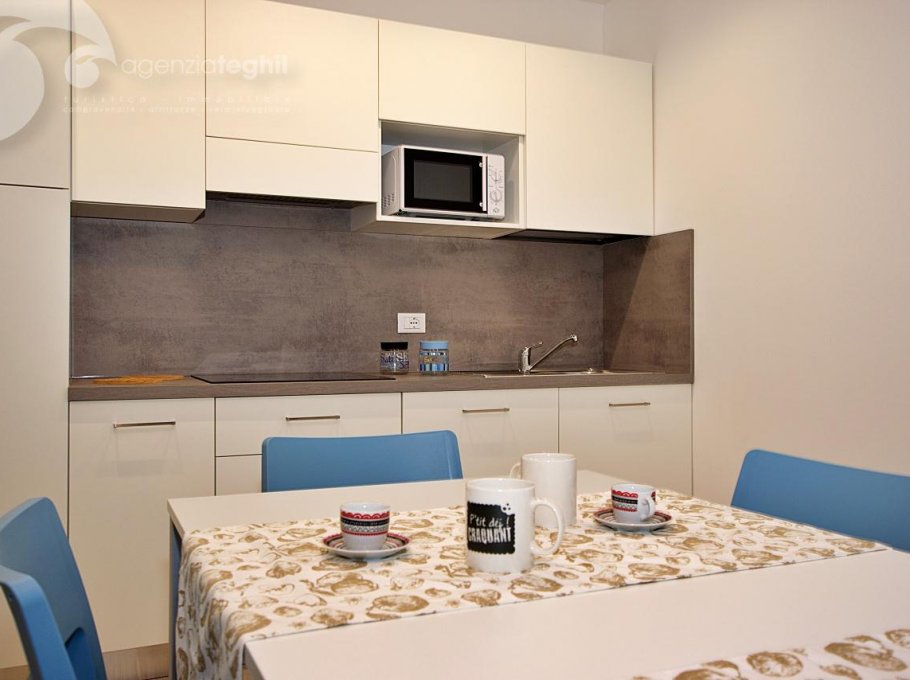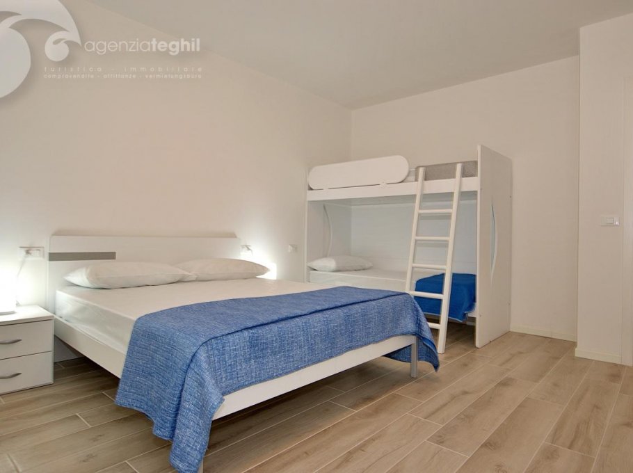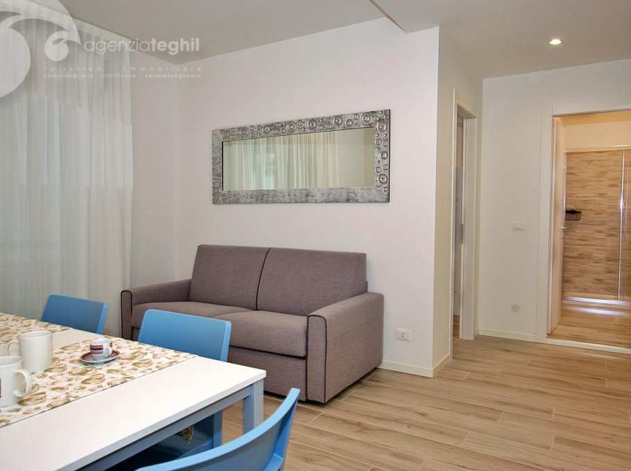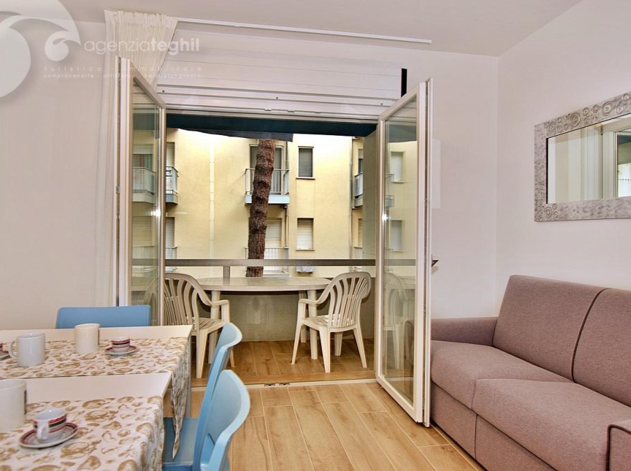 Type B: 4/5 people - Fully renovated first-floor apartment (elevator), consisting of a bedroom with a double bed and a bunk bed, terrace; living room with a double sofa bed, television (only Italian programs), and terrace furnished with outdoor table and chairs; kitchenette with induction hob, 240-liter double-door refrigerator, and microwave; windowless bathroom with shower cubicle and electric extractor fan. The apartment also includes a washing machine, dishwasher, electric boiler for hot water, air conditioning, and a reserved parking space.