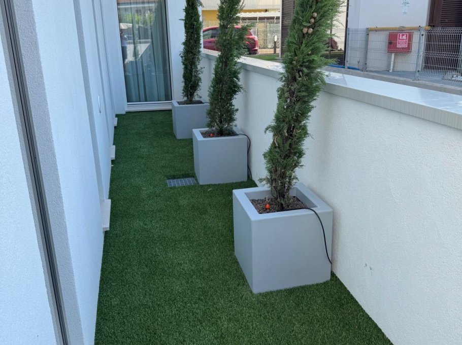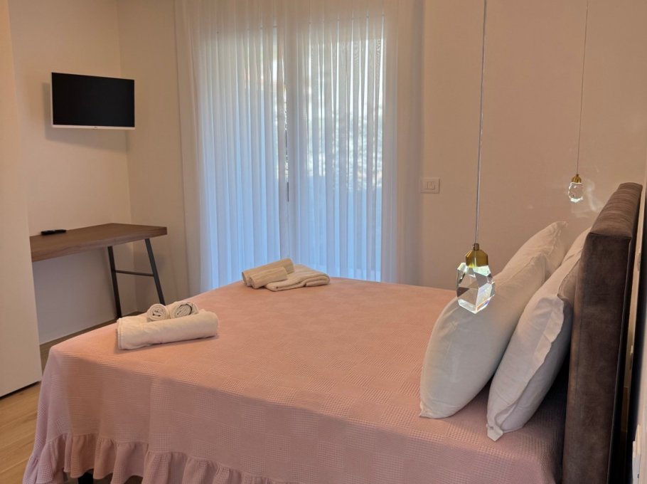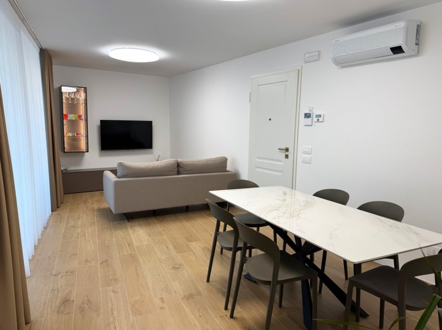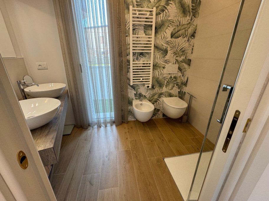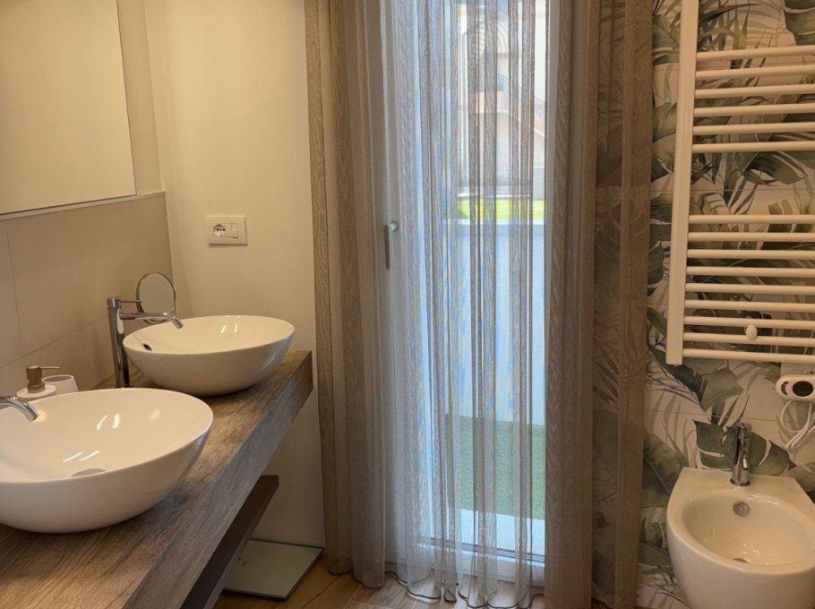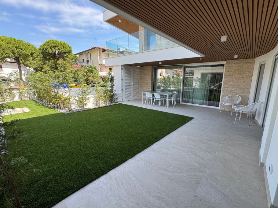New building in Sabbiadoro, near the sea. The building is composed of three apartments, two on the ground floor with large private space/garden and one on the first floor. With high quality finishes, fully equipped and linen service and midweek cleaning are also offered, included in the price