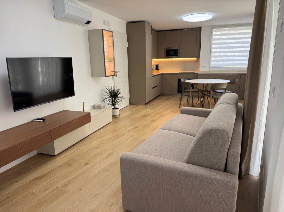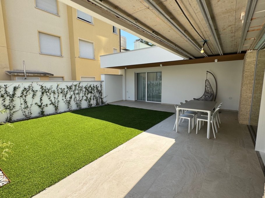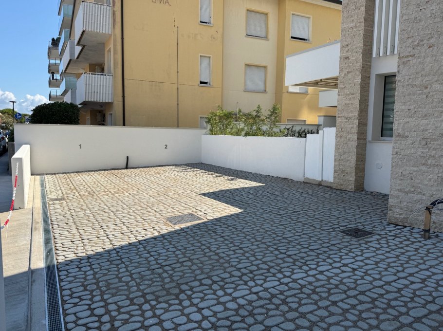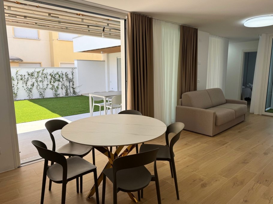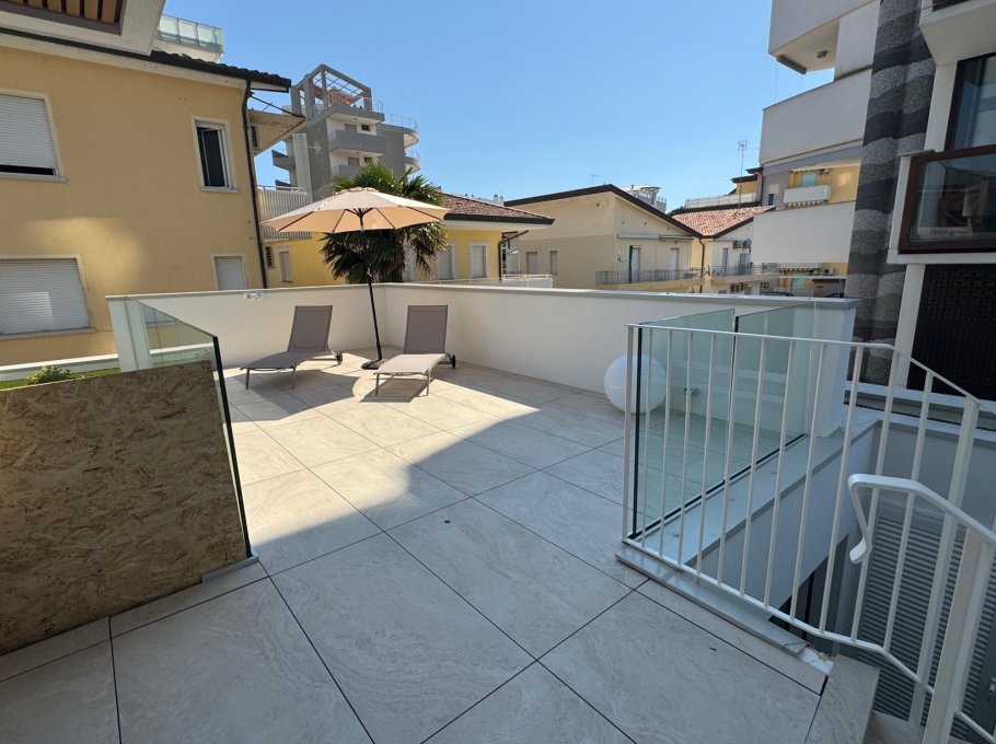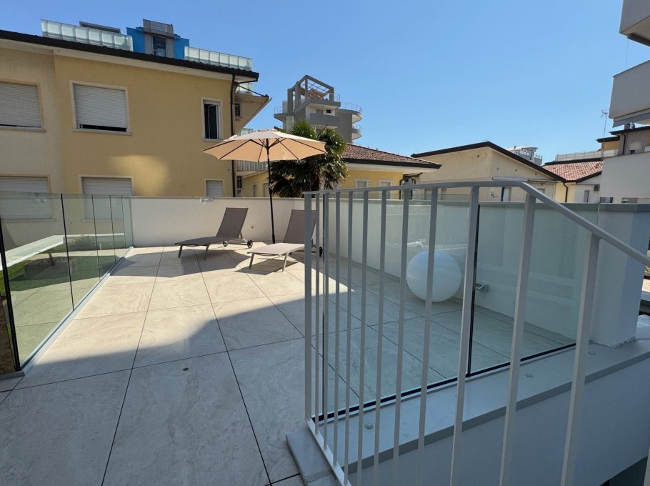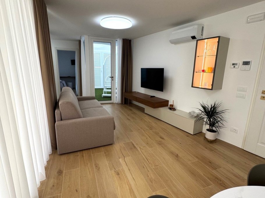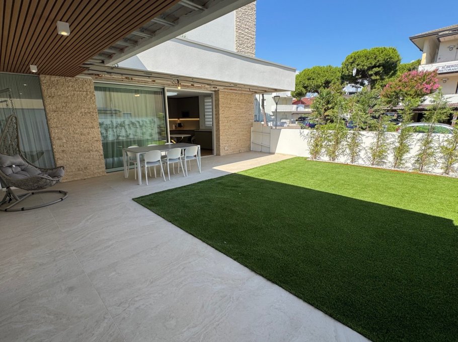 New building in Sabbiadoro, near the sea. The building is composed of three apartments, two on the ground floor with large private space/garden and one on the first floor. With high quality finishes, fully equipped and linen service and midweek cleaning are also offered, included in the price