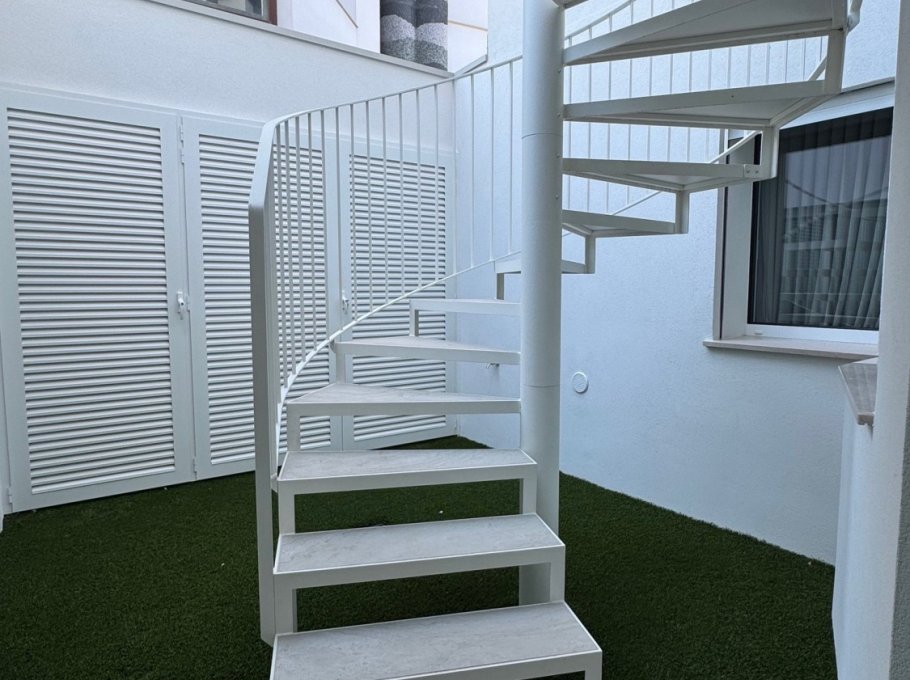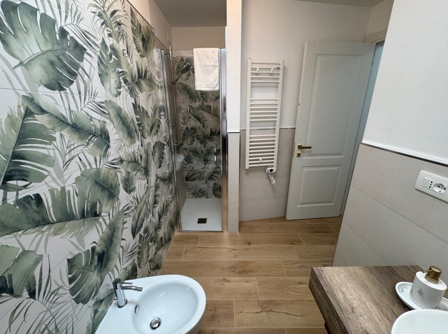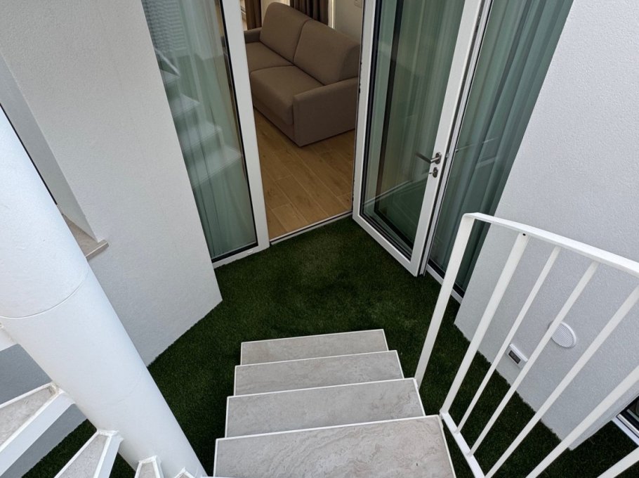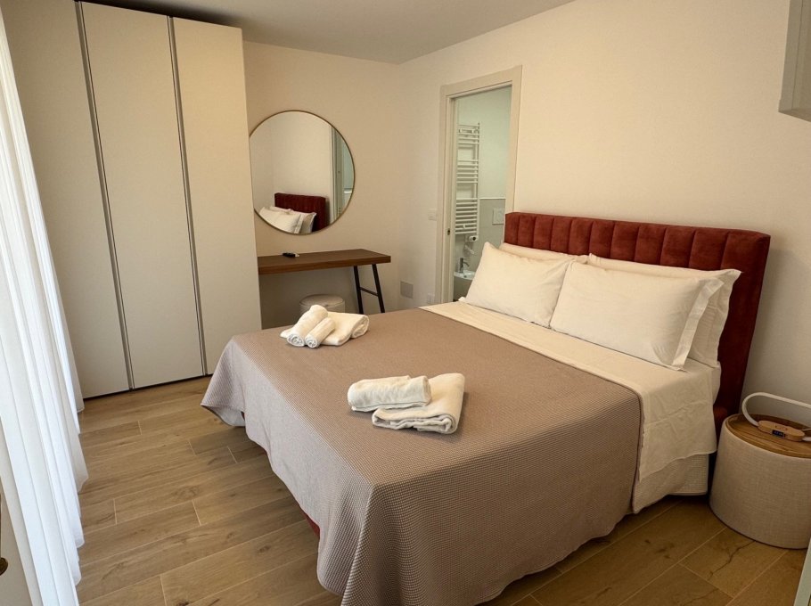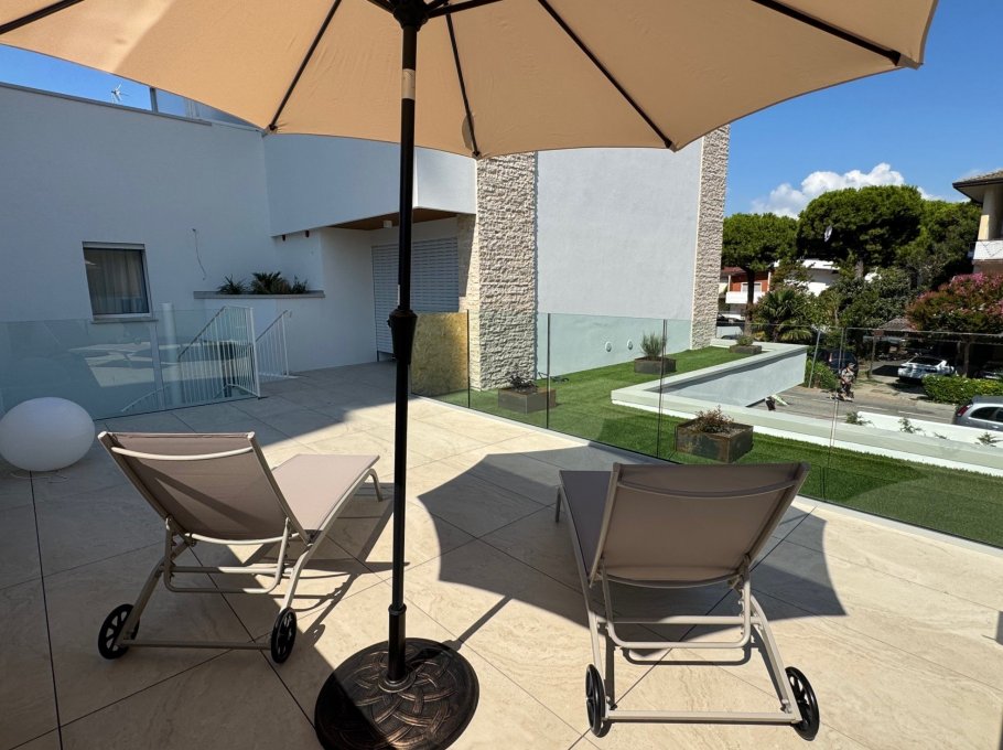 The living area is characterized by large windows that overlook an outdoor terrace, a real relaxation corner furnished with table and chairs, ideal for summer dinners or simply for the pleasure of being outdoors. Among the comforts included, you will find a washing machine, a dishwasher and air conditioning, for simple management of daily life, as well as Wi-Fi connection to always stay connected. There is also a private solarium on the firts floor, equipped with two sun beds and a beach umbrella, with direct access from the apartment.