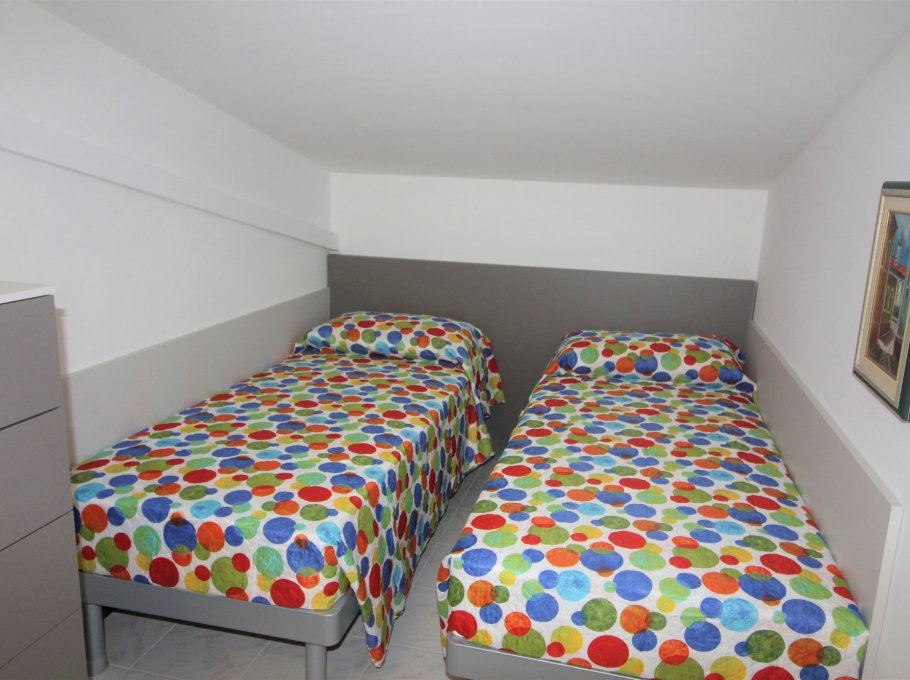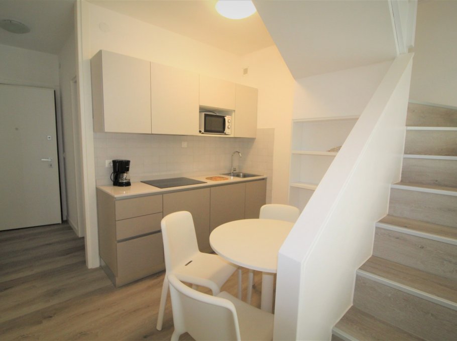 Type B: living-dining room with sofa bed, cooking corner, bathroom with shower/WC, balcony with garden furnishings; on the floor above large mansard with 1 double bed and 1 or 2 single beds, spacious balcony (some units with large corner terrace). For 4 people. Ideal for families with children - air conditioning unit, dishwasher, wasching machine. Energy class D (146.02 kWh/Qm yahr). CIN: IT030049C2YAI6L4I6