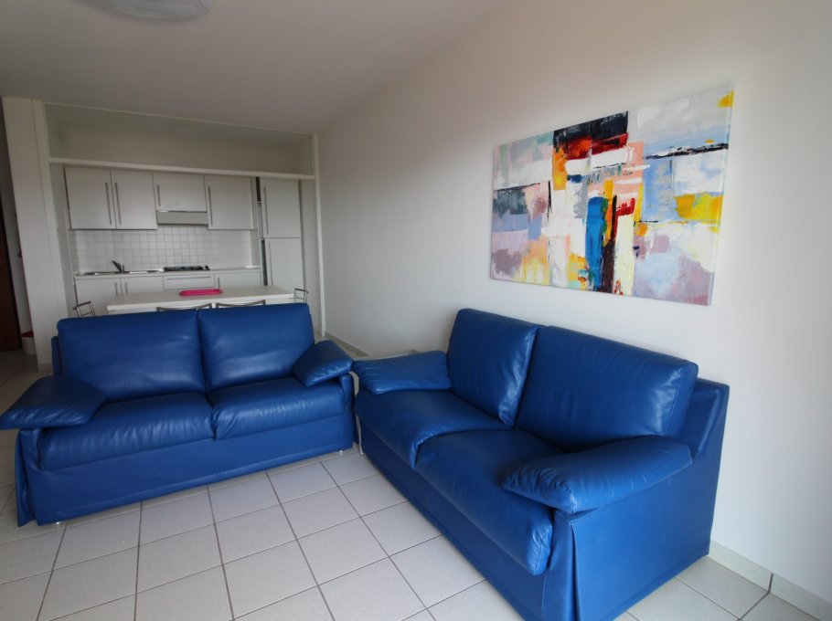 Type C: the apartment, renovated in 2024, lies on the 7th and last floor and is composed by a living-dining room with kitchen corner, a spacious and furnished balcony with lateral view to the sea and the lagoon, a double bedroom, a bedroom with two single beds, a sofa bed in anteroom, a bathroom with shower/WC. For 5 people. Ideal for families with children - TV - air conditioning unit - washing machine. Energy class D (106.48 kWh/sq m year). CIN: IT030049C22IX7L9FP