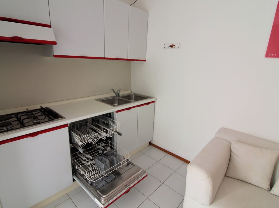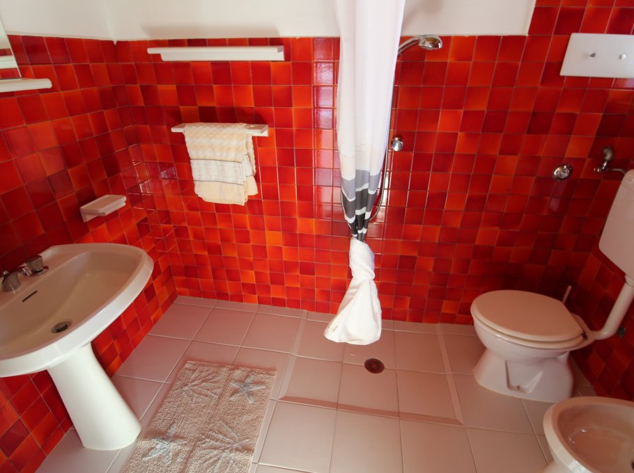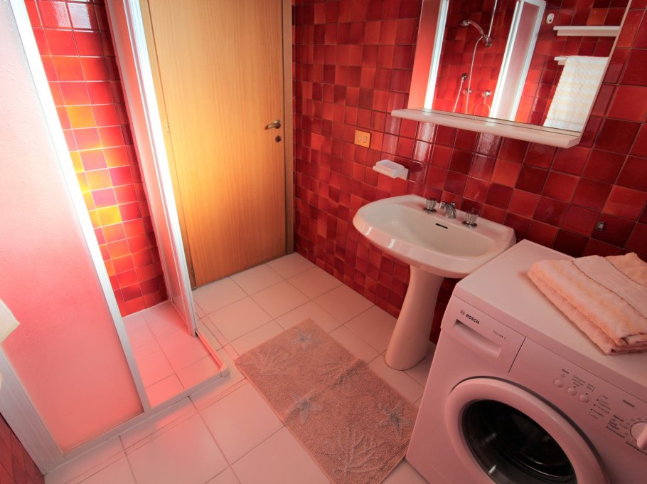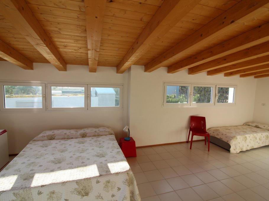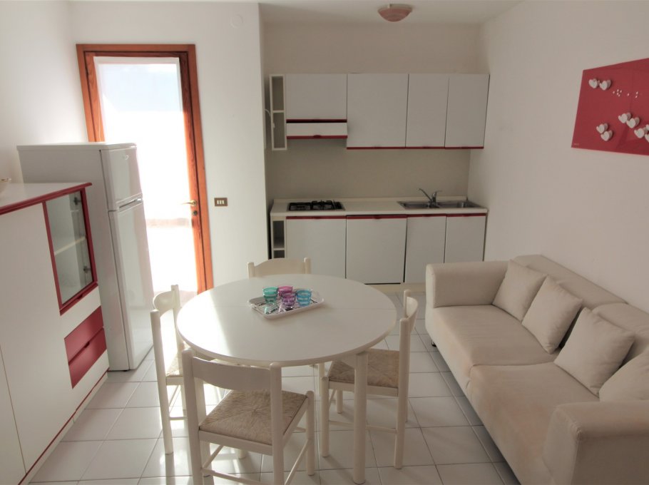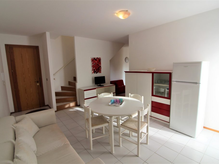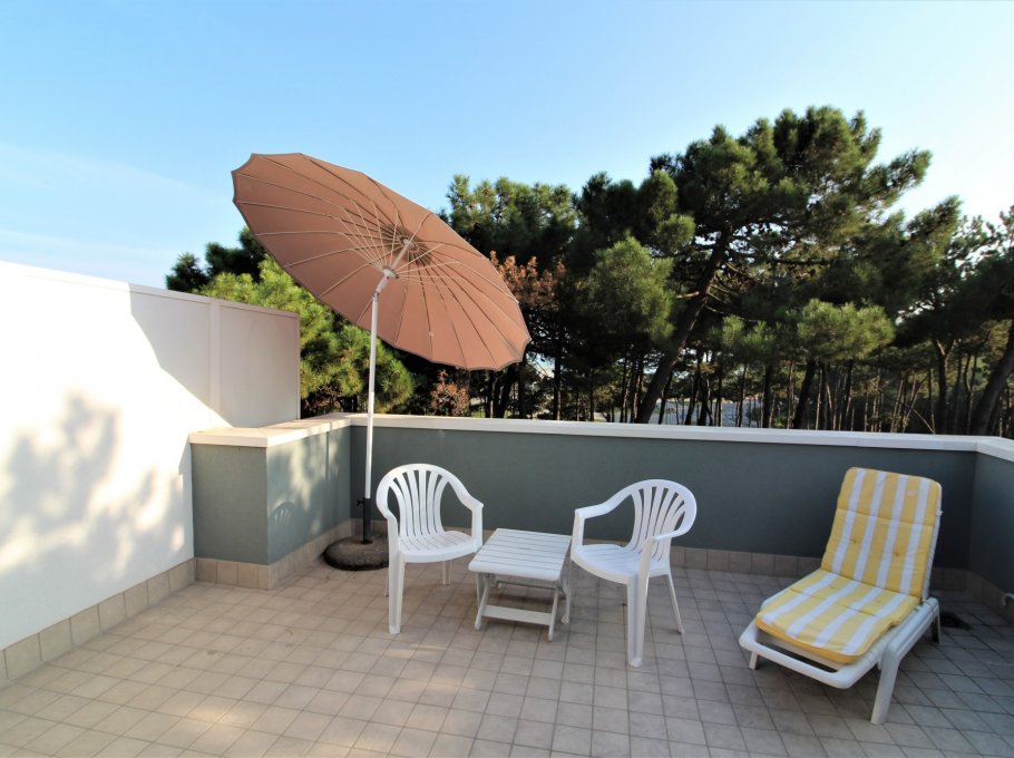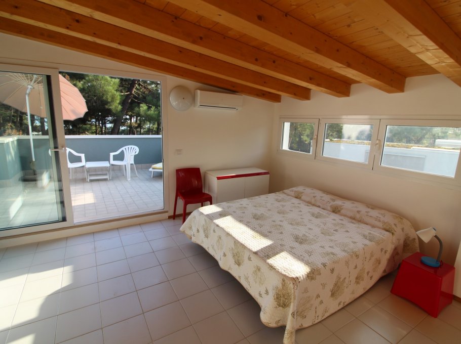 Type D: living / dining room with couch and kitchenette, a room with 1 double bed, a room with 2 single beds, 1 bathroom with shower / WC, large corner balcony; upstairs spacious mansard room with 1 double bed and 1 single bed and , large terrace with view on pine woods. For 6-7 persons. Well suited for families with children - TV - Air conditioning unit - Dishwasher - Washing machine. Beach service (1 sun umbrella, 1 sun chair and 1 sun bed) provided on request and subject to availability. Energy class B (91.38 kWh/sq m year). CIN: IT030049C2KK3JLYKI