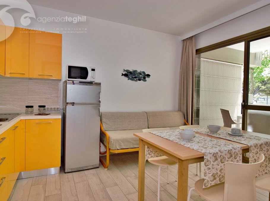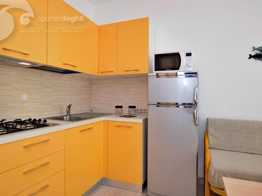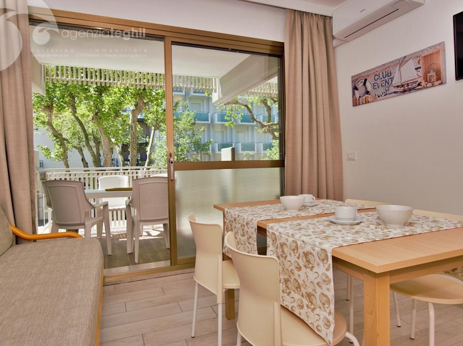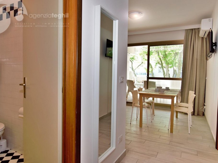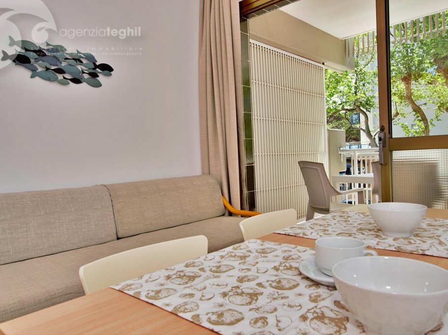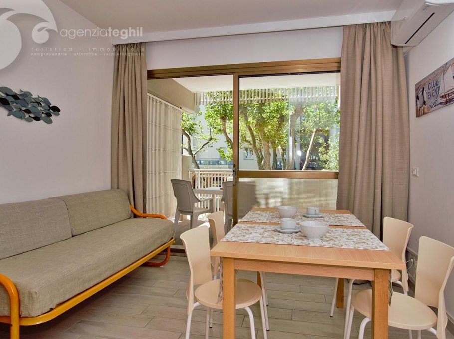 Type C: 4/5 people - Apartment on the 1st floor, with lift, composed of a living room with double sofa bed and large terrace overlooking the beach, equipped with outdoor table and chairs; kitchenette equipped with a 240-liter two-door refrigerator; one double bedroom with terrace, one bedroom with bunk bed, bathroom with shower and vent fan. The apartment is also equipped with air conditioning, wifi and a reserved parking space in the garage.