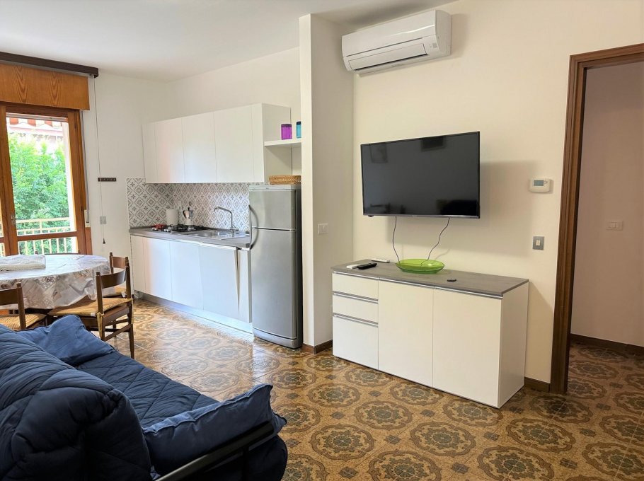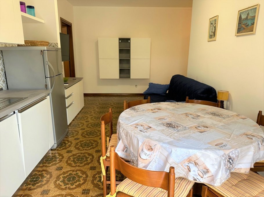 Roomy and renovated apartment on the 1st floor of a building located in a side street in the center (via Tirrenia) of Sabbiadoro next to a supermarket, about 250 meters from the beach. It is composed of entrance, living room (where there is a sofa bed) with kitchenette, bedroom with double bed and single bed, bathroom with window, two terraces and numbered parking space. It also has a washing machine, dishwasher and air conditioning.
