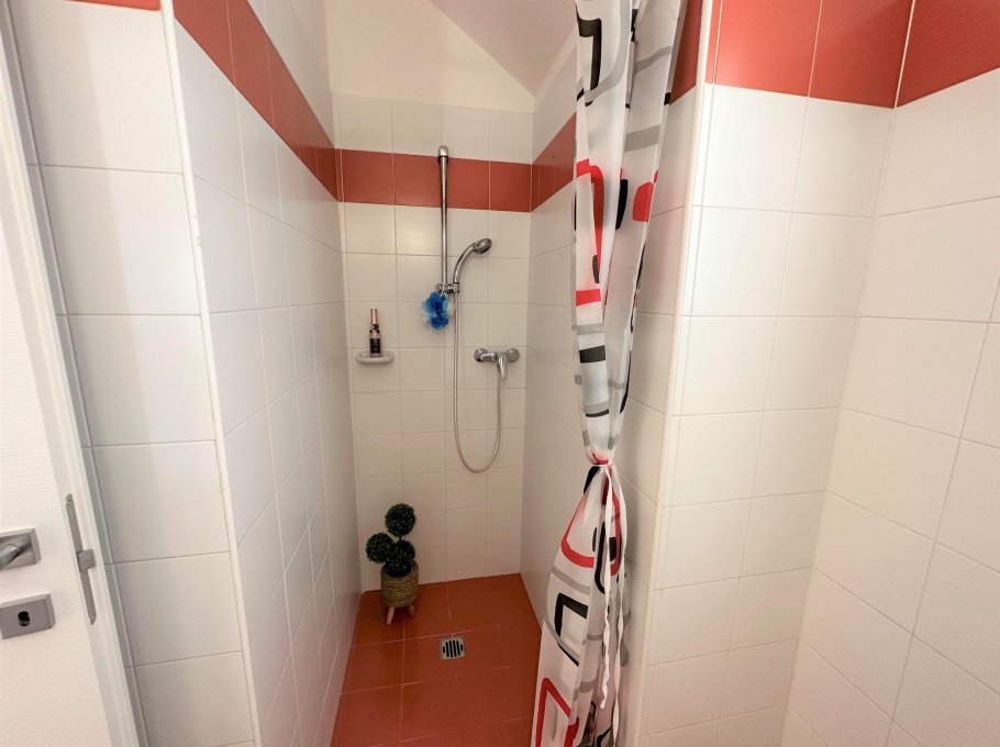Three-room apartment on the ground floor consisting of living room with double sofa bed, small separate kitchen, utility room, one double bedroom, one triple bedroom, bathroom with shower and window. Outside a large fenced garden, shared with the upper floor apartment and two parking spaces for each unit.